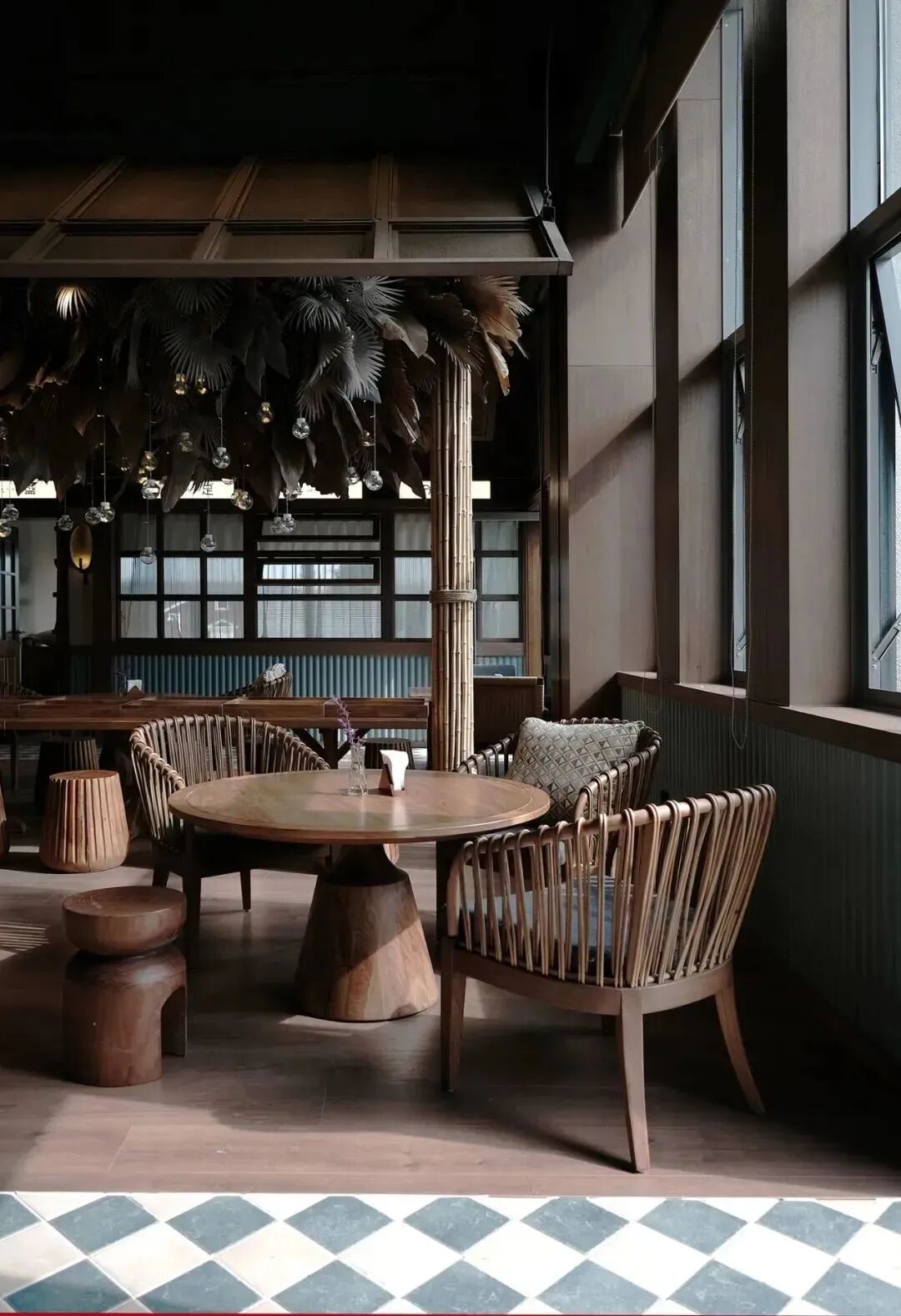 步入山谷深处,在一处石谷中,升起的篝火成为空间焦点,粗粝纹理的木纹桌椅、咖啡色的皮艺、随性铺洒的松树皮,以及拙朴的东南亚手作草编圆墩……在浓淡相宜的阴翳之美里,酝酿出安逸自在。