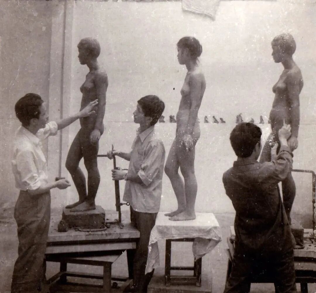 1980年3月叶毓山先生在《女人体》泥塑课教室讲人体结构的穿插关系