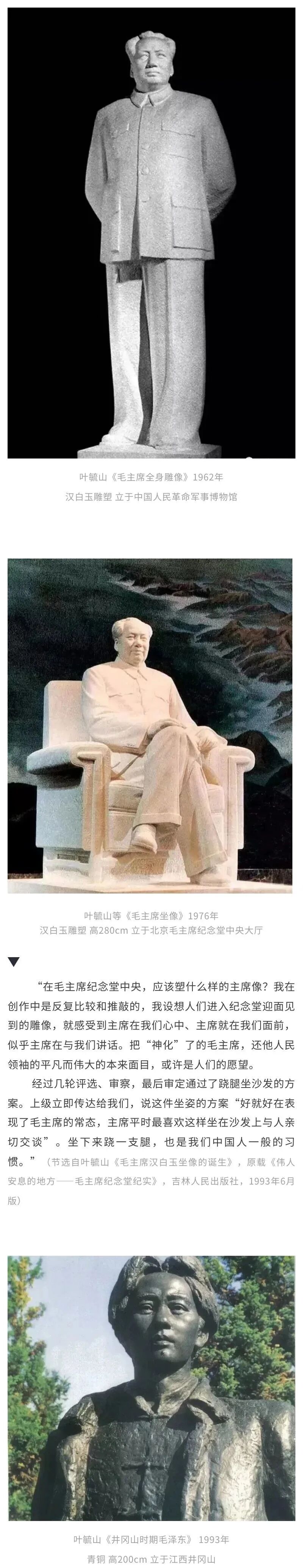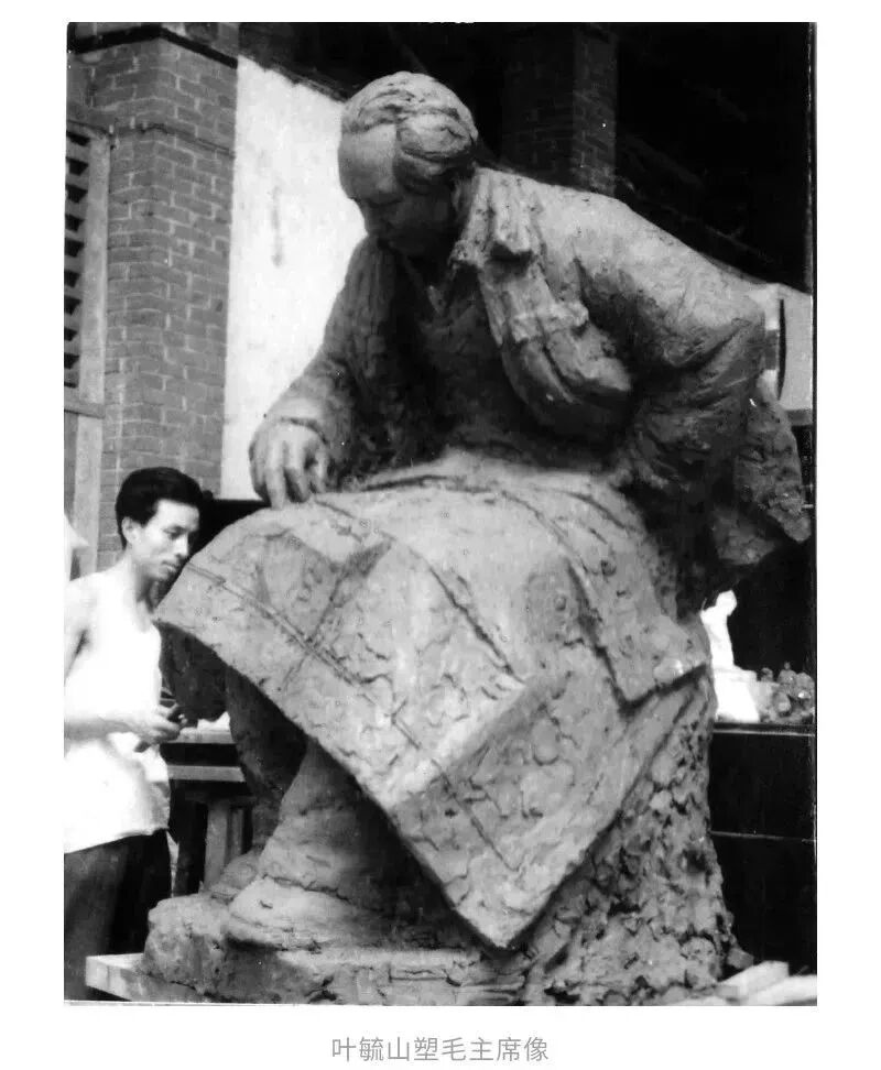 在做歌乐山烈士群雕时,主体部分是采取1∶4放大。泥塑定稿只做四分之一大,泥塑定稿做好后翻模分块交给石工放大四倍。头像则要求准确,必须是1∶1等比例放大。我也参与了头像放大工作,在放完后将头像翻模交石工师傅雕刻,结果石工师傅在雕刻其中正面主要人物头像时,装点线器出了一点误差,快完成时才发现人物的脸颊有一块面积厚度差一点点,如果顺势修平也可以,但现场人员不敢做主,请叶老师来看。结果叶老师来一看不仅没责怪石工师傅反而大为高兴,认为那一块还未剁斧的面积保留了花岗石开荒留下的天然的粗粝肌理,在这一特定场景特定人物的脸上,恰恰表现出烈士所处环境的惨烈和精神的倔强。马上叫石工师傅停下,只做了一点微小的衔接处理,最后完成的效果确实令人叫绝。(节选自余志强文章《永恒的高山——恩师叶毓山及其雕塑创作》)