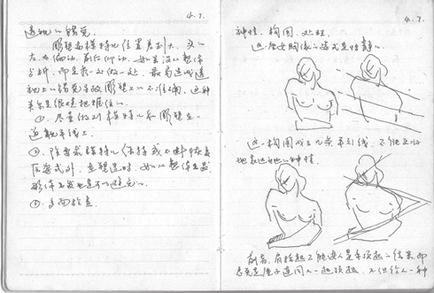 模特儿是一个有生命的人,同时也是有思想、有感情的人。所以我们在写生时,决不能冷冰冰地去翻解剖,为搞结构而搞结构,而是在对于对象的形体有了感受之后,带着一种表现的冲动来尽力地塑造对象,有时甚至可以有分寸地得意而忘形。”(节选自项金国《我的老师——作为教师、作为院长、作为大师的叶毓山》课堂笔记摘抄)