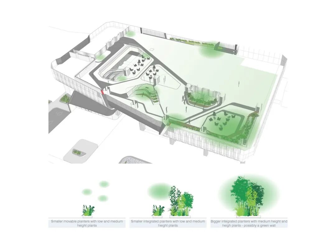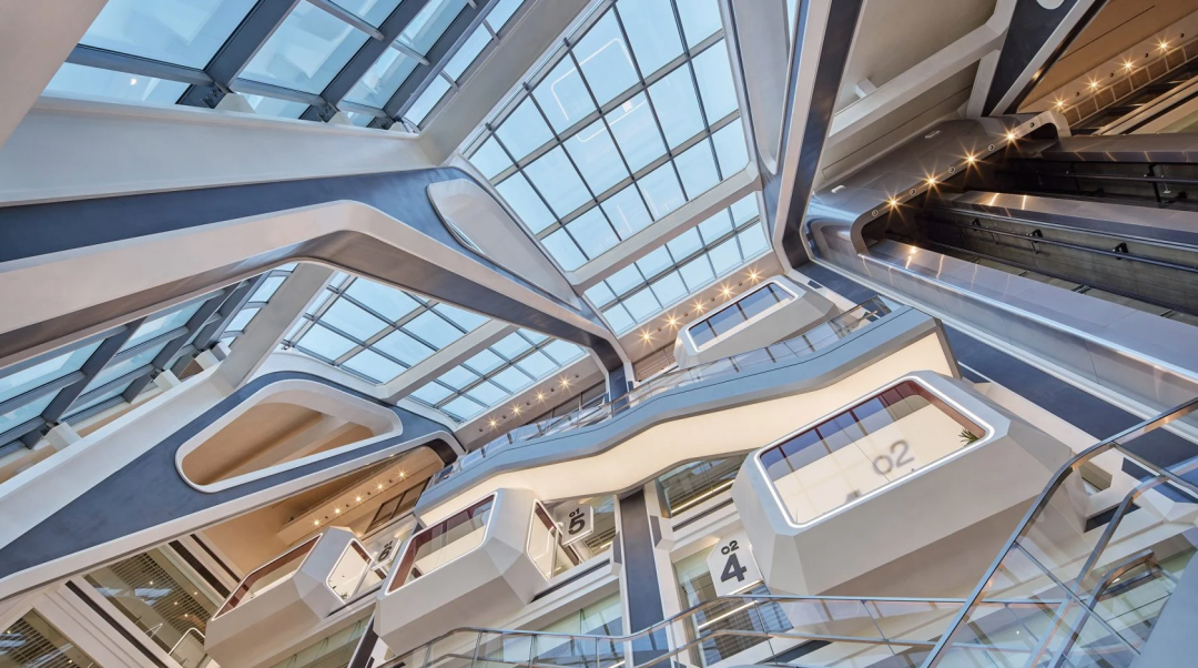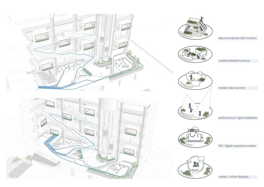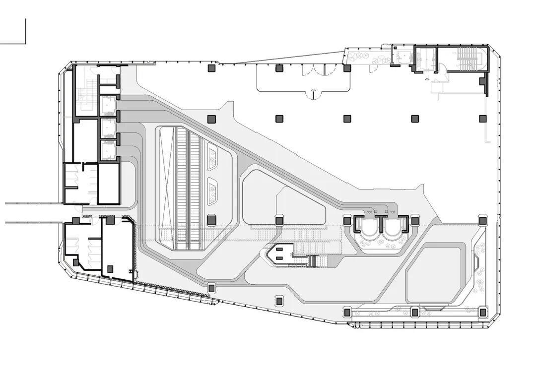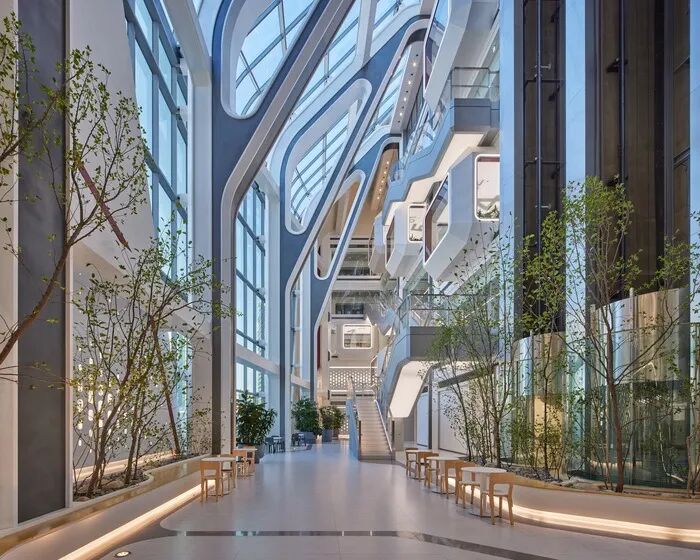 中庭的内立面一侧设有胶囊状会议室,这些会议室可以作为“工作区”或“休息区”。