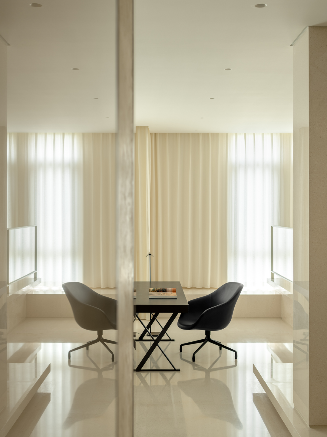 楼梯间从一层到三层纵向打通,套景手法也同步贯彻。两个独立的空间彼此延伸,规整和谐。三层则略显外凸,交错的体块与严谨的配比,进一步彰显着细腻的处理。