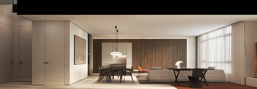 观其状,描其境,透过近景玄关、中景过渡、远景客厅的套景手法,由收到放、逐步推引。注入变幻的光影,相应的抽象情绪也随着视觉落点而转换,在感性与理性的交融之中丰盈家的内核。