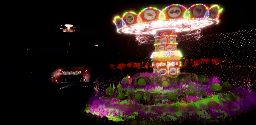 如梦如幻的游乐园,不停旋转的彩色木马,一轮高挂在天边的红色血月……捕梦网的成员们在富有空间感的舞台上进行一首又一首的歌曲表演,而XR技术则将观众的视觉、听觉带到她们所创造的童话世界中,共同沉浸在嘉年华式的派对氛围。