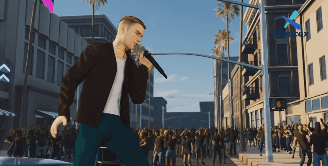 在虚拟制作技术的助力下,比伯还实现了对表演场地的跨越,他就好像拥有瞬间移动的超能力,可以在这个元宇宙世界中自由穿梭。