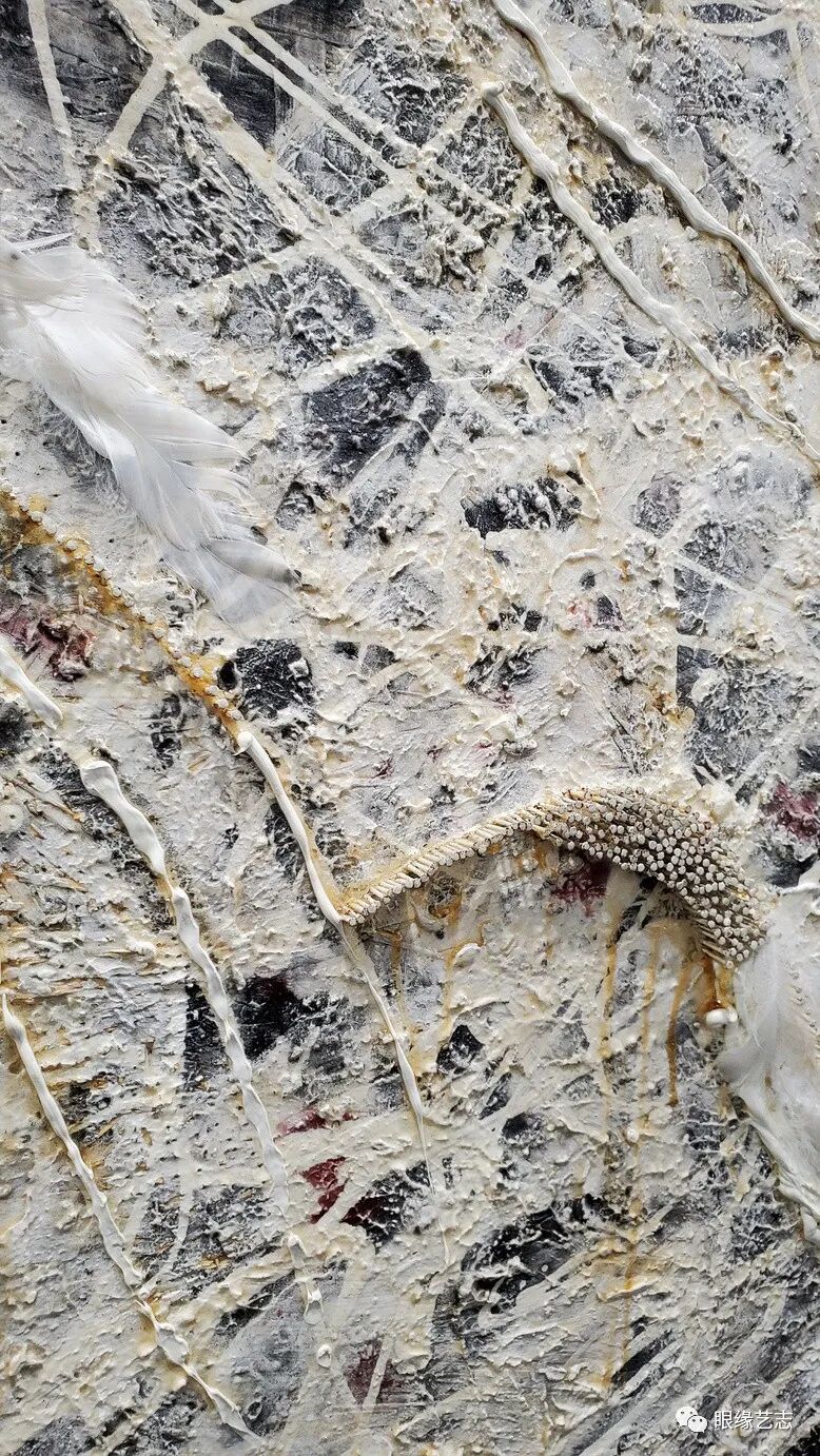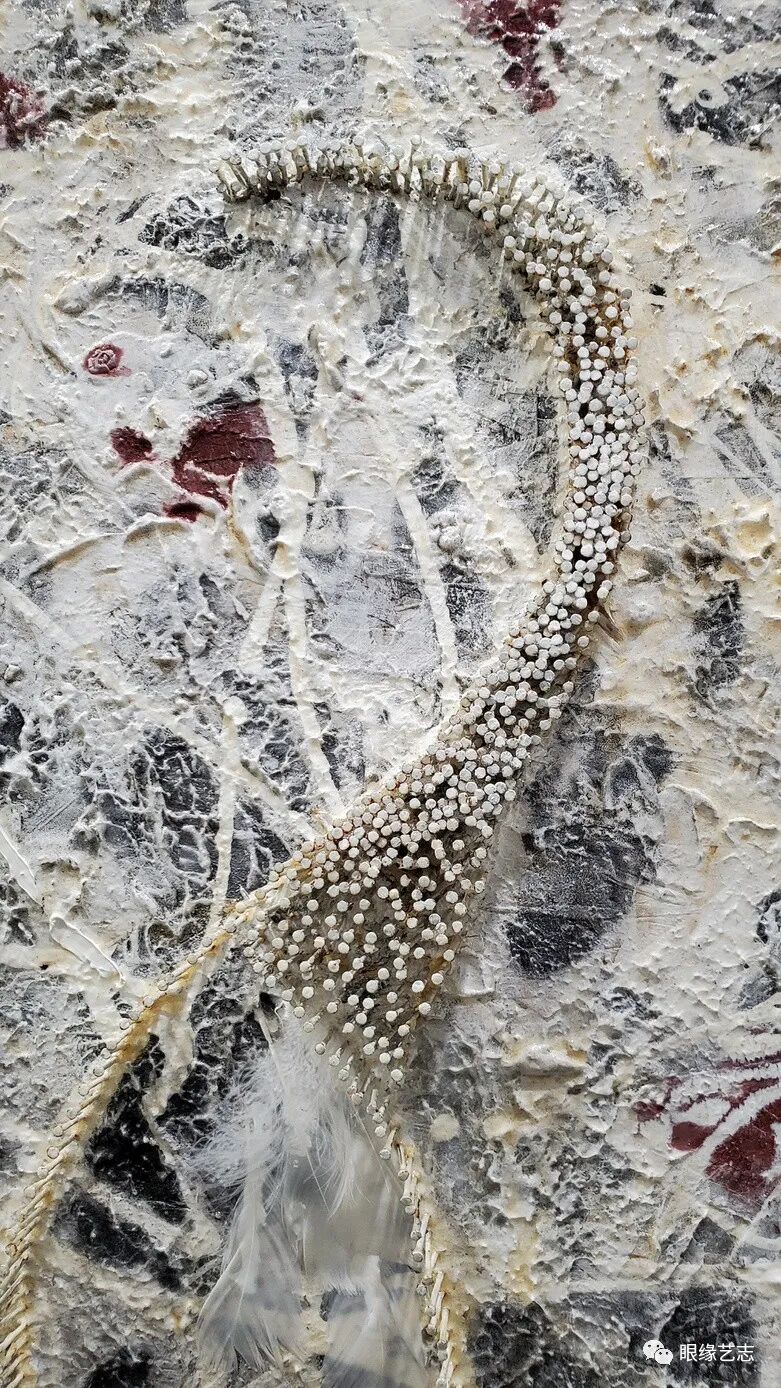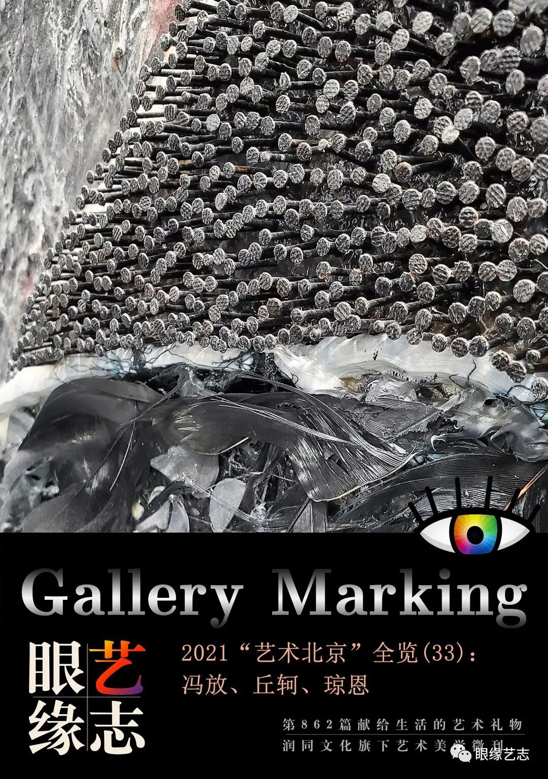 在创作中,冯放借助对纸浆、矿石粉、染料、铁钉的运用,挖掘着东方的意象性审美,同时也表达了自己文化寻根的意图。他从传统的道家文化中分离出洒脱、孤傲的气质,再加以抽象的提升与意象的渲染,使其在似与不似间,散发出一股令人震撼的浩然之气。