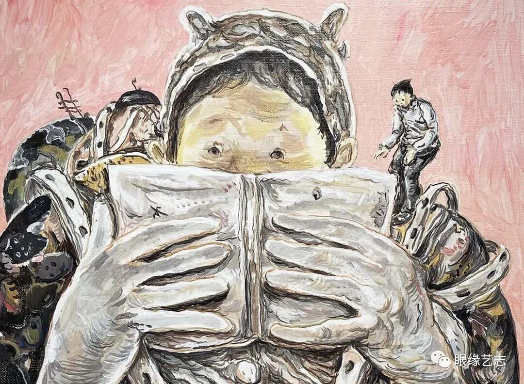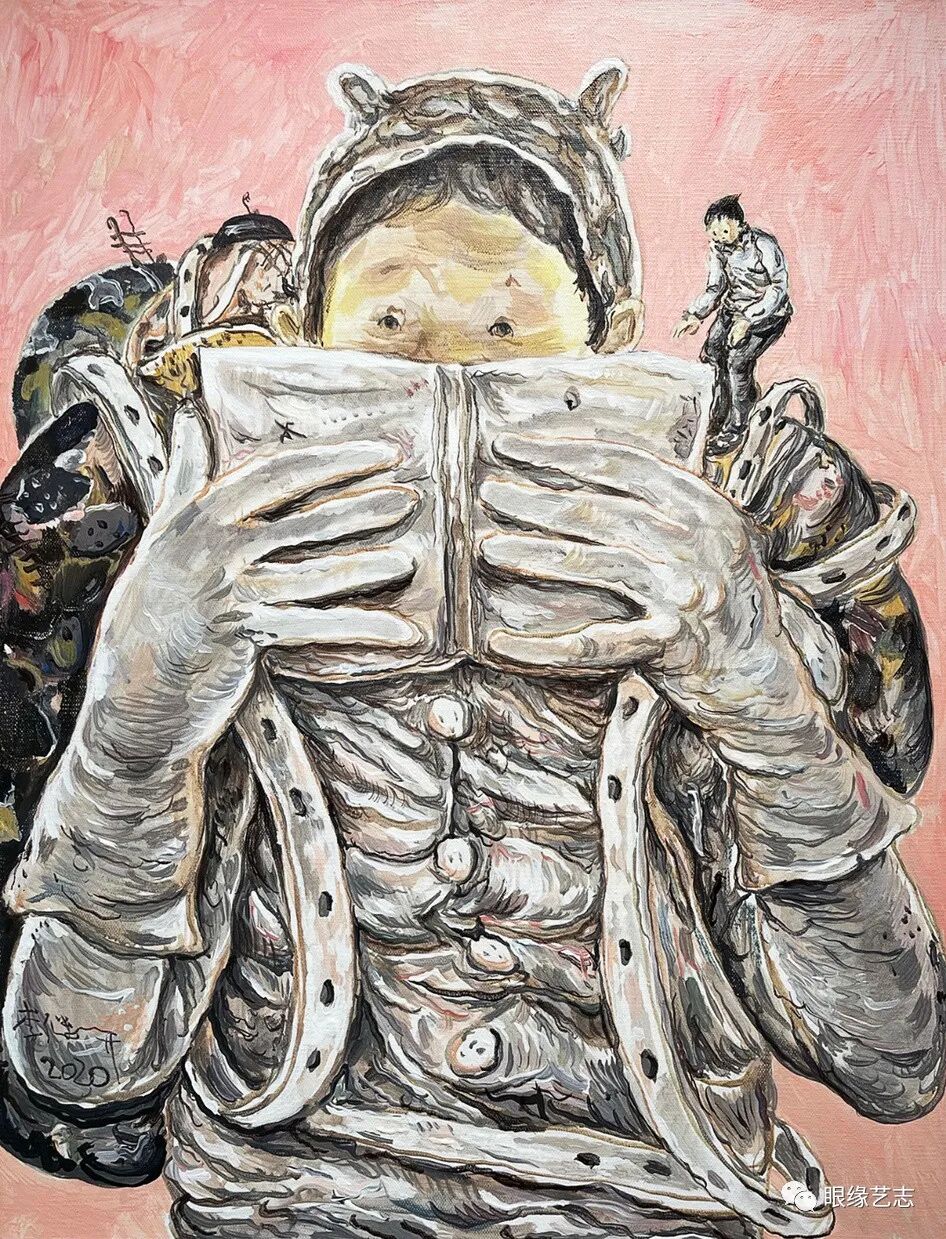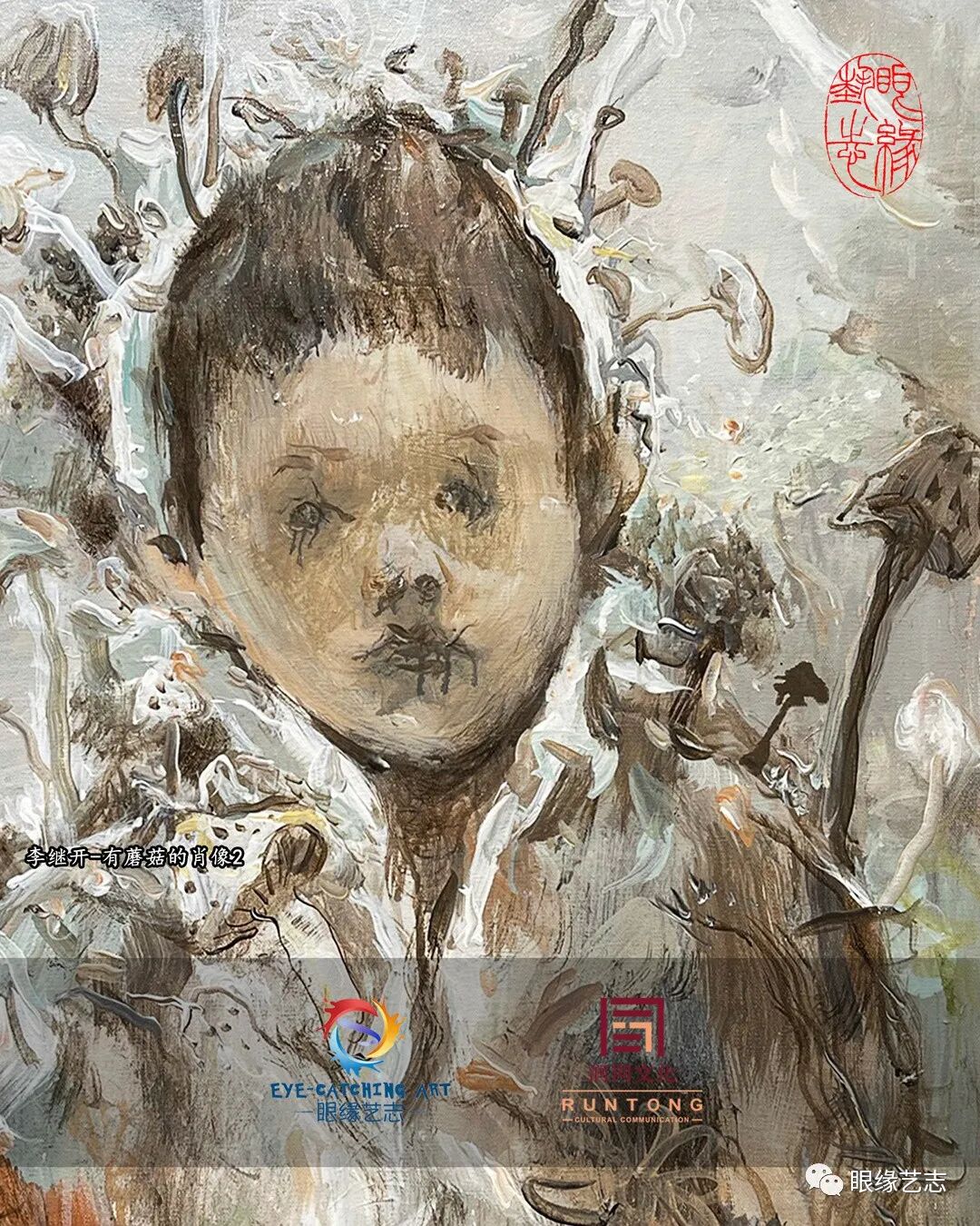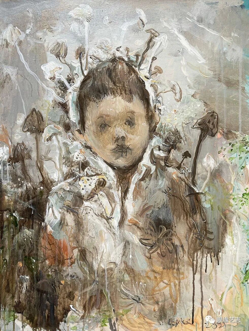 在他构建的世界中,孩童是理解其作品的一把钥匙。在《有蘑菇的肖像2》中,男孩将衣服紧裹,似乎在害怕着什么,本应古灵精怪的年纪却显得深沉而忧郁,略显粗狂的笔触描绘着耐人寻味的拘谨表情。画家将他所感受到的时代变迁,以魔幻荒诞的手法掰开揉碎,然后再重构起来,一点点地展现在观者的面前。