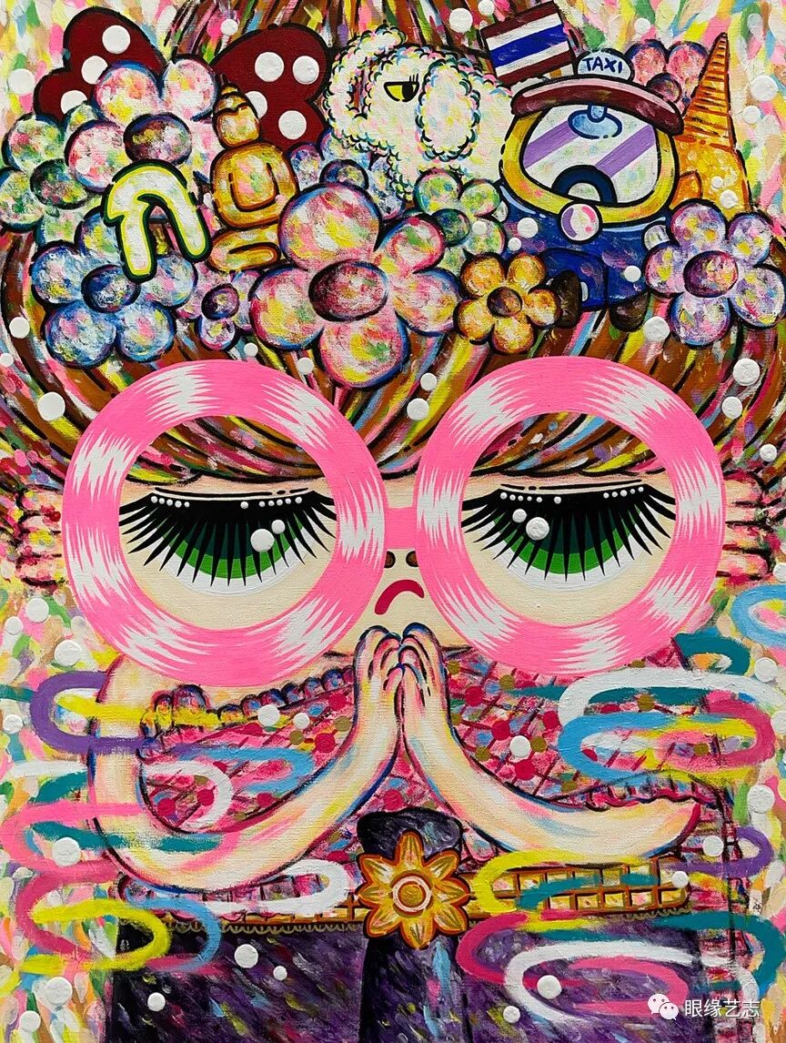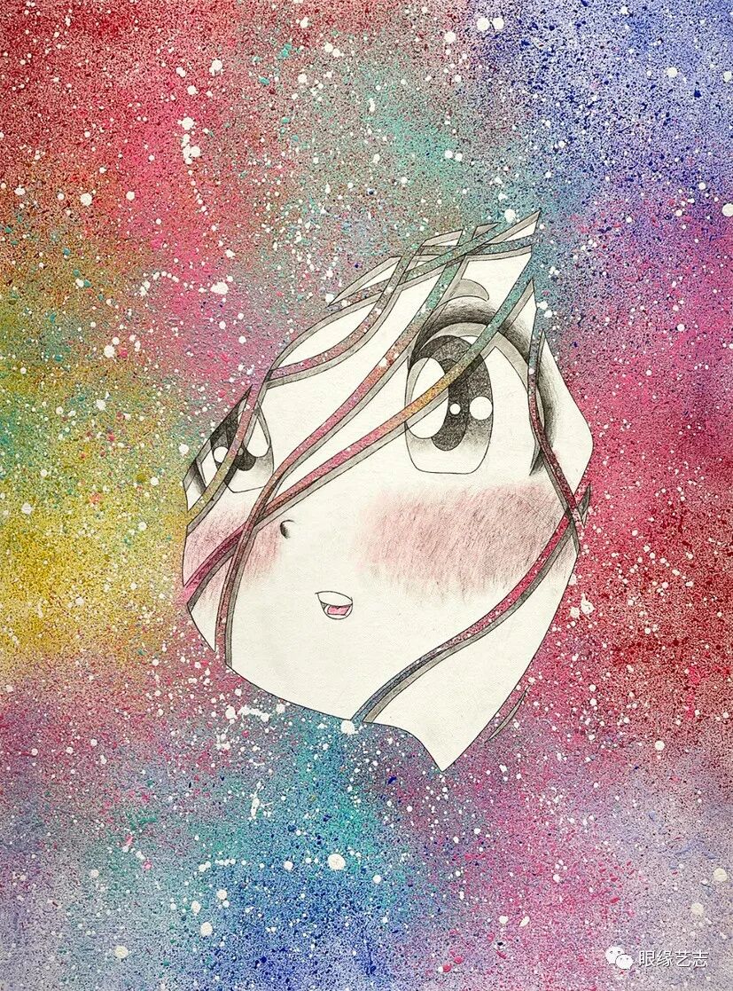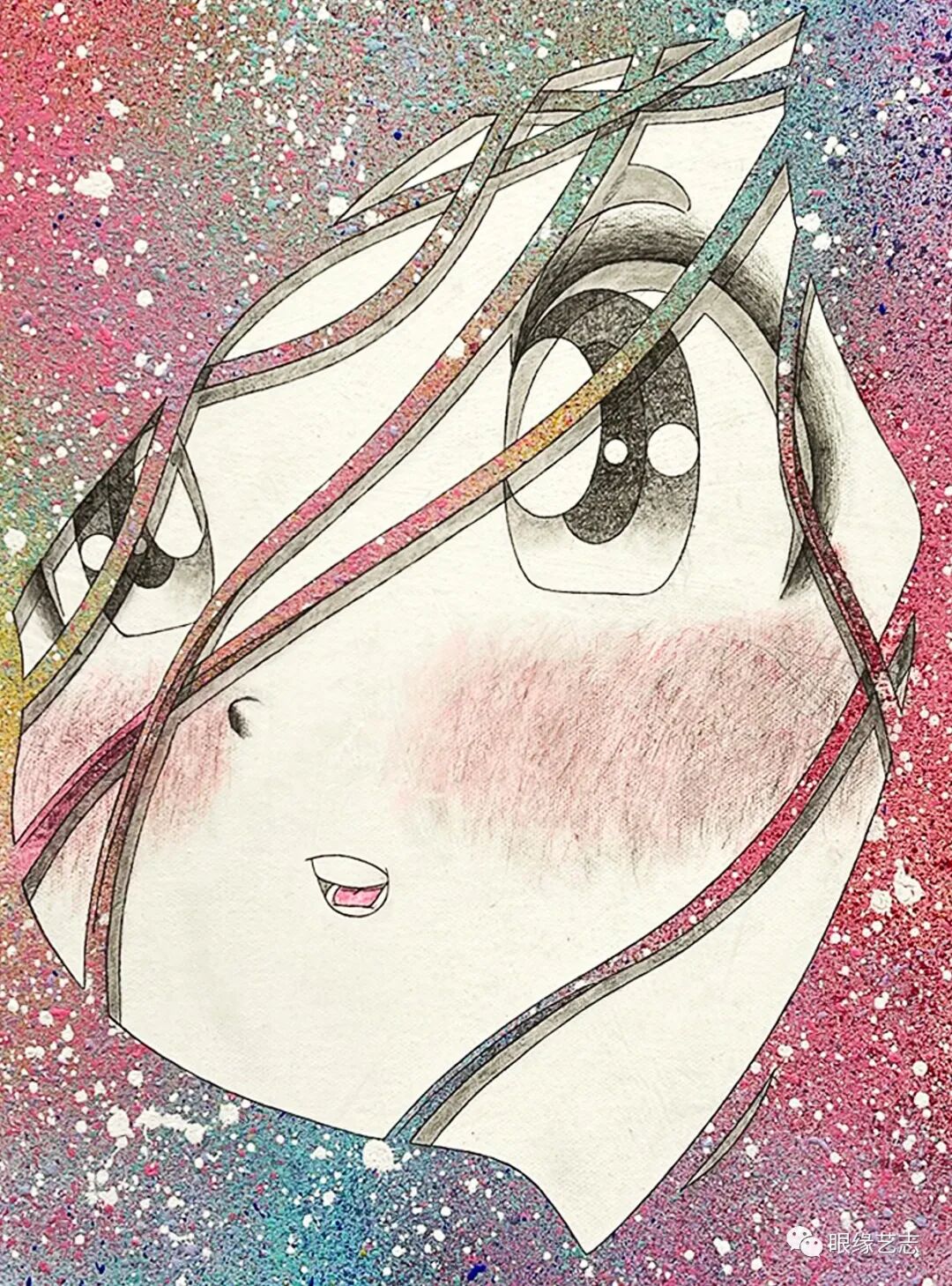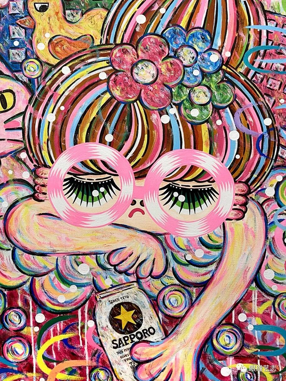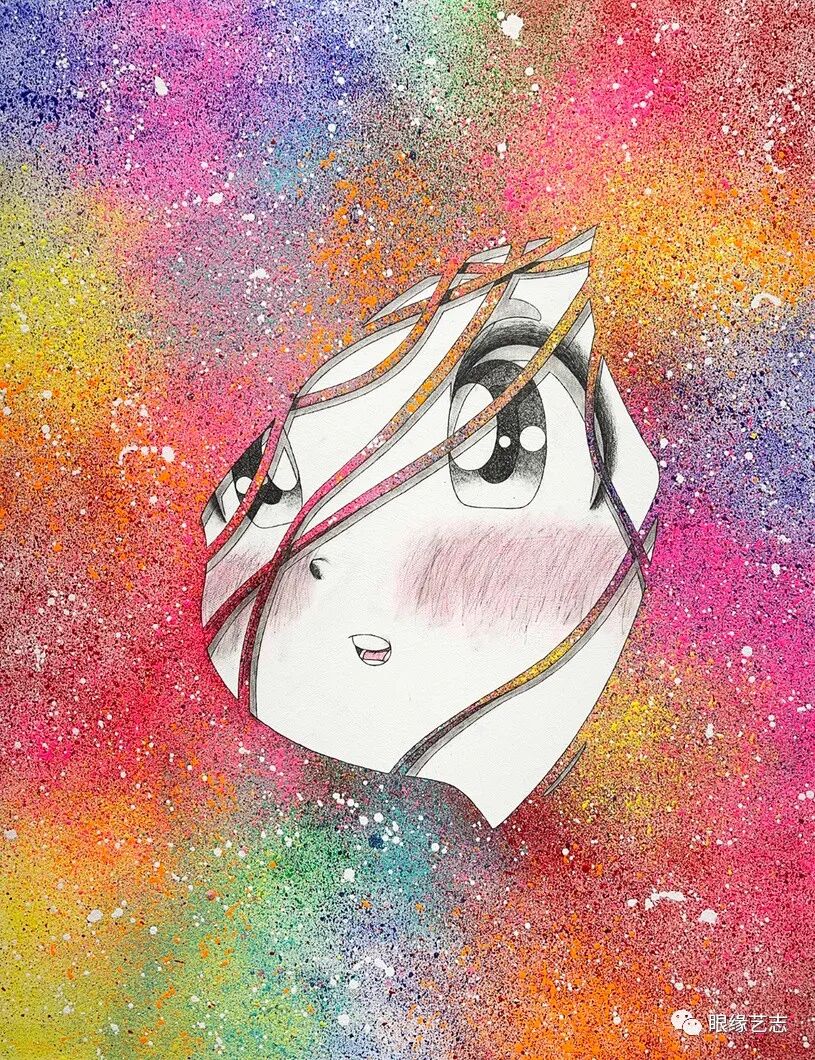 追随二次元时,会获得一种“快刀斩乱麻”般的舒爽体验。但是每当故事结束,那种难以言表的厌世感便会从可爱的元素中脱离出来。在中居铃的设想中,鲜艳的色彩会暂时掩盖悲伤和愤怒的情绪。而当观者注视画作时,首先会看到纷繁多变的色彩堆叠,其次才会发现女孩藏在眼镜之后的愤怒表情。中居铃用卡通式的绘画语言描绘了与她如影随形的桎梏,那就是“总是无法自由地表达真实的感觉与思想”。