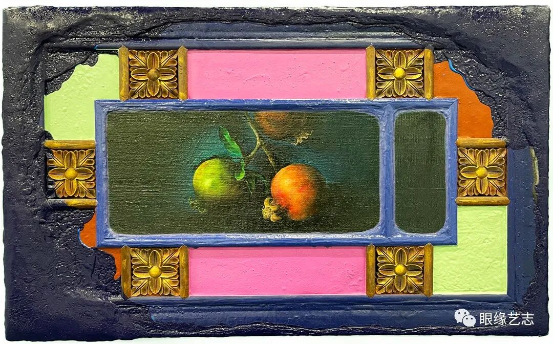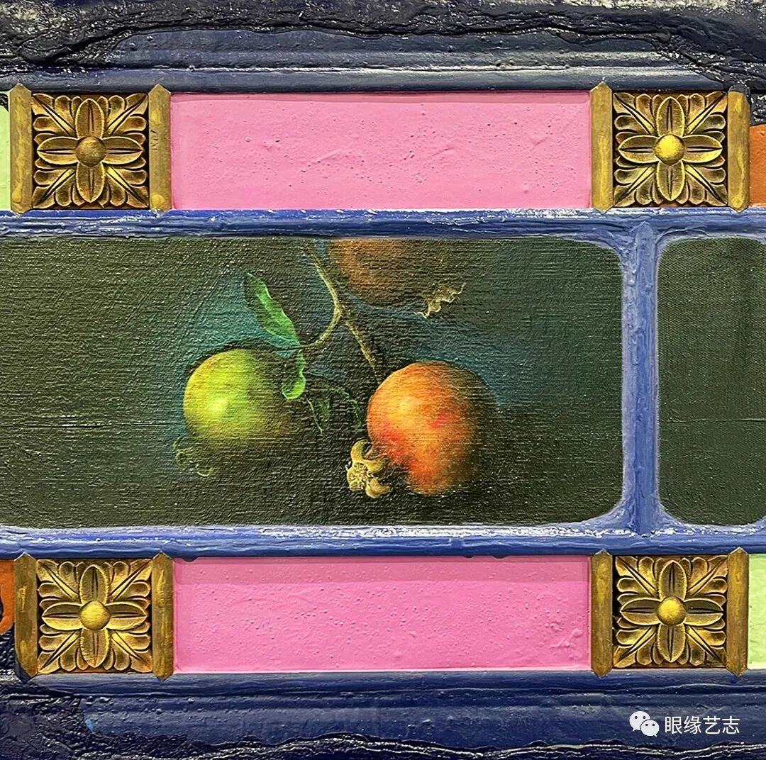 杨永生以动植物为主线,巧妙地吸收了中国画的审美,并结合中国民间美术的形式,用油画表达了中国画的内容与情怀。他在创作中直接选用民间花窗、花板等材料,再重新绘制原有的图画,并以陶瓷石膏填充、上色。
