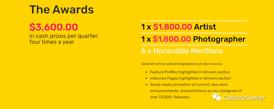 奖项:本次将有两位艺术家获得 1800.00美元的补助金和四个荣誉奖项。凡投稿艺术家都将获得展示与未来宣传的机会。