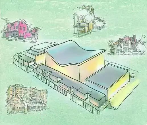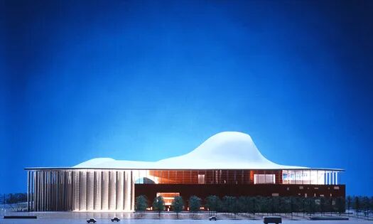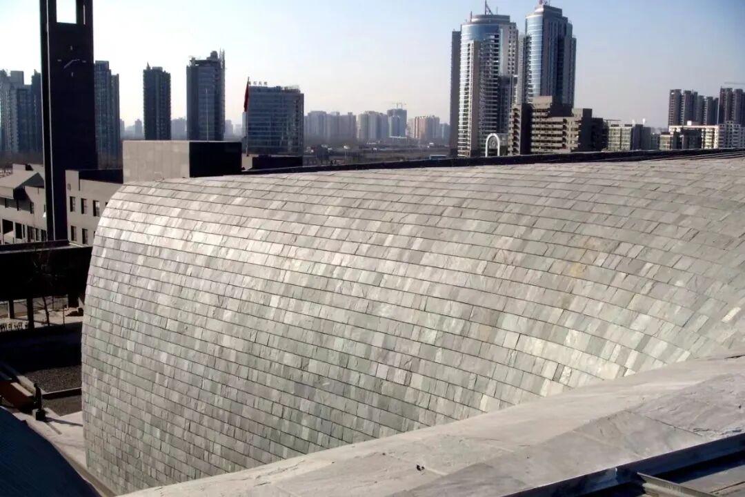 大剧院的大屋顶最具个性特征,将剧院的大空间包裹起来,与剧院周围环绕的一系列列柱,描画出一道柔和的曲线。