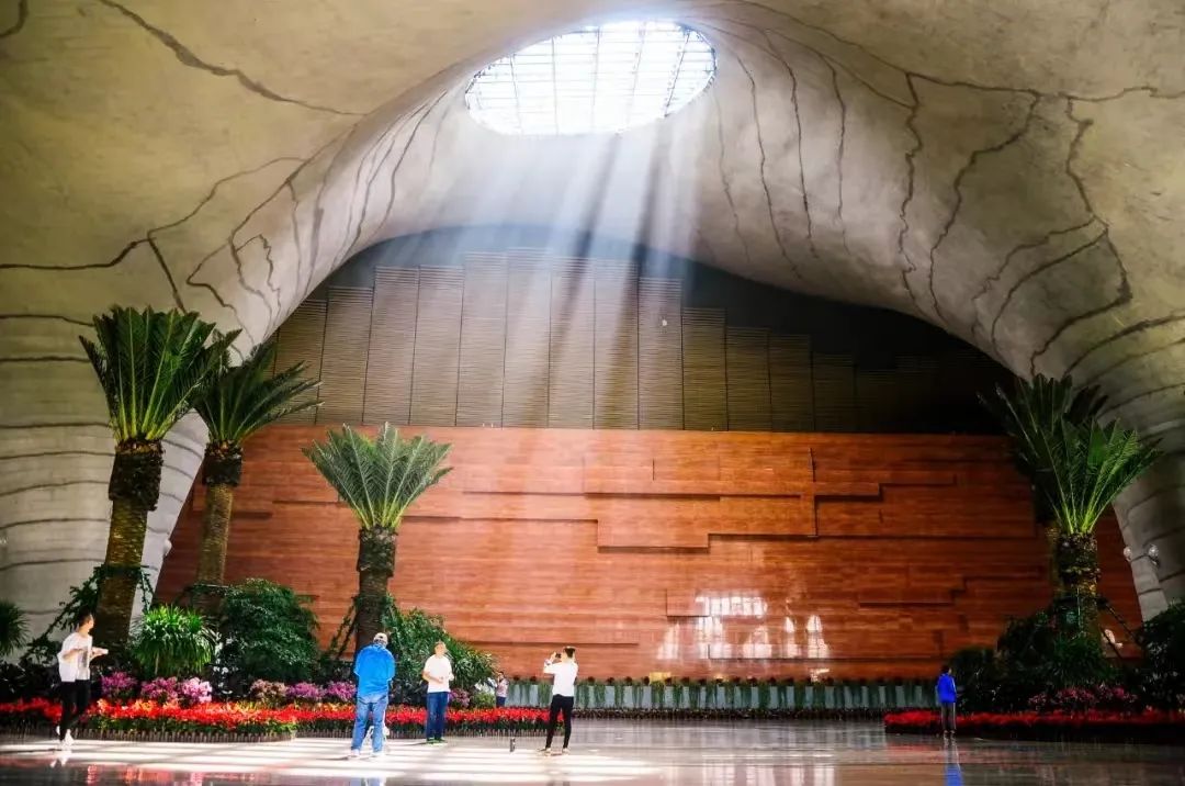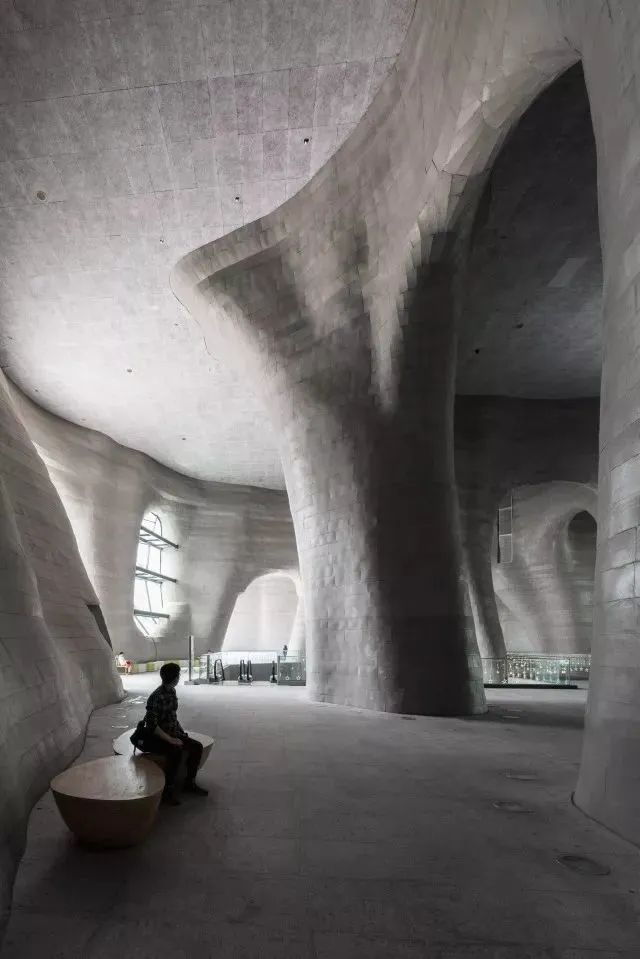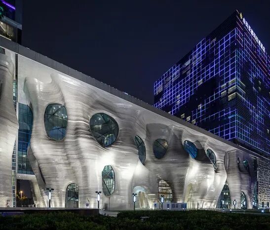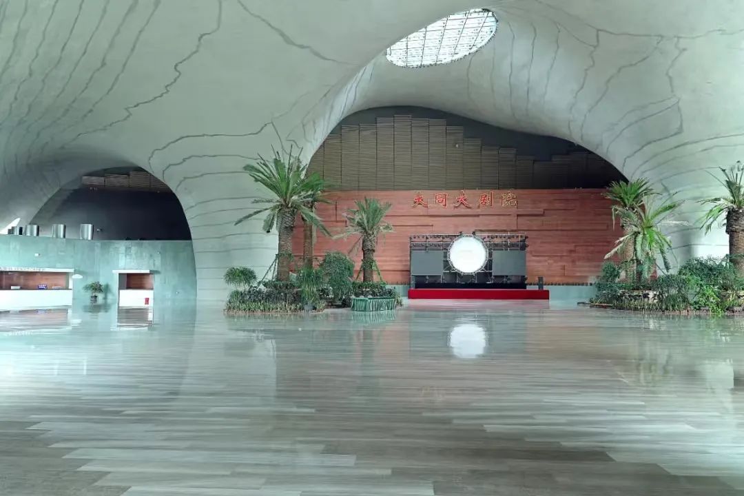 连绵起伏的山岭,外壳的窗面则像云冈石窟的一个个洞窟而内部大小剧场共用一个舞台后场,这在全国绝无仅有。