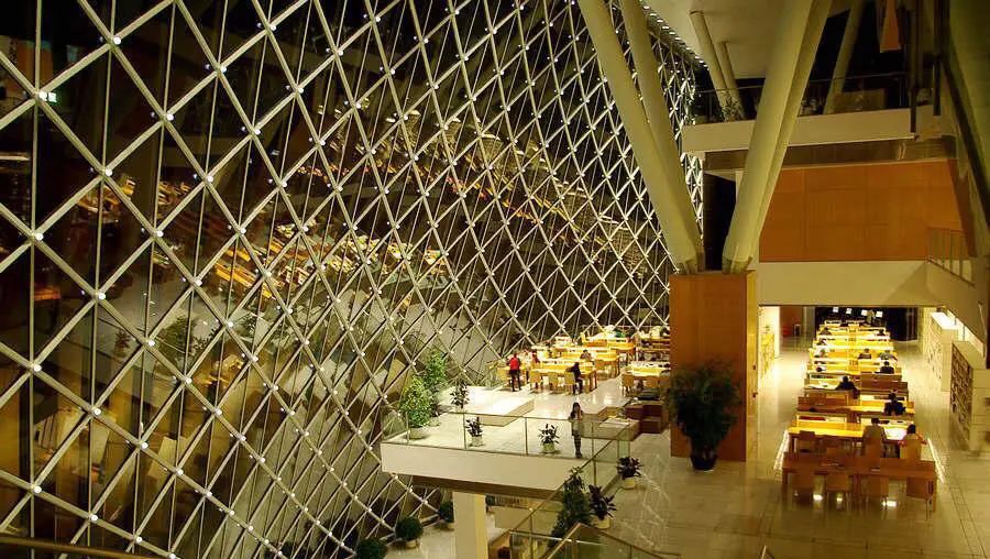 设计通过将音乐厅和图书馆的地下停车场和地上人行平台连接的方式,使深圳文化中心成为一个具有两个独立功能的建筑整体。