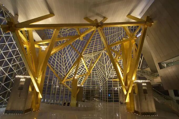 “黄金树“是一项结构难度极大的钢结构工程,是当时中国建筑工程中的首次应用。建筑形体由五个主要元素构成。