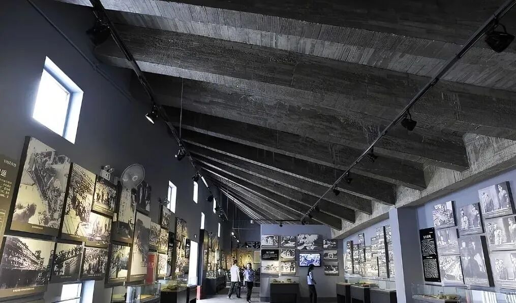 灰色残旧的外墙,曲折逼仄的入口,狭长的展厅里只有一侧有窗,头顶上混凝土房梁的倾斜线条铺陈着历史的轮廓。