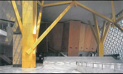 如同天书一样的符号巧妙地表达了世界文字相通的独特思想,而整个设计中最让矶崎新感到自豪的部分就是外形类似树干的异型结构,那就像生生不息、自然生长的林木。