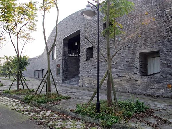 美术馆外墙覆盖灰绿色的岩板,跟美院内其他建筑的灰砖颜色相协调,协调中富有变化,整个外部结构整齐和谐、层次分明。
