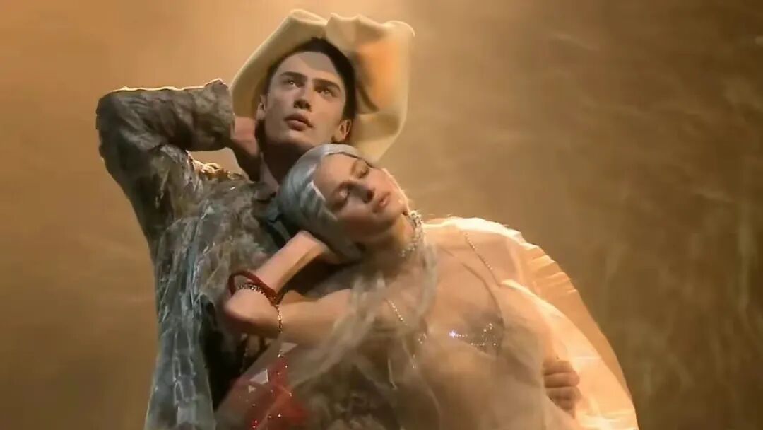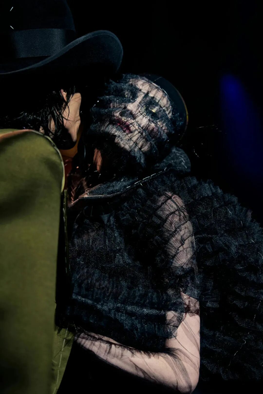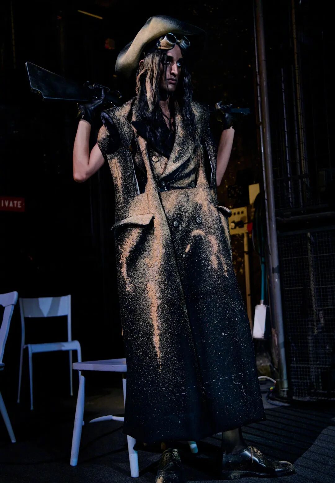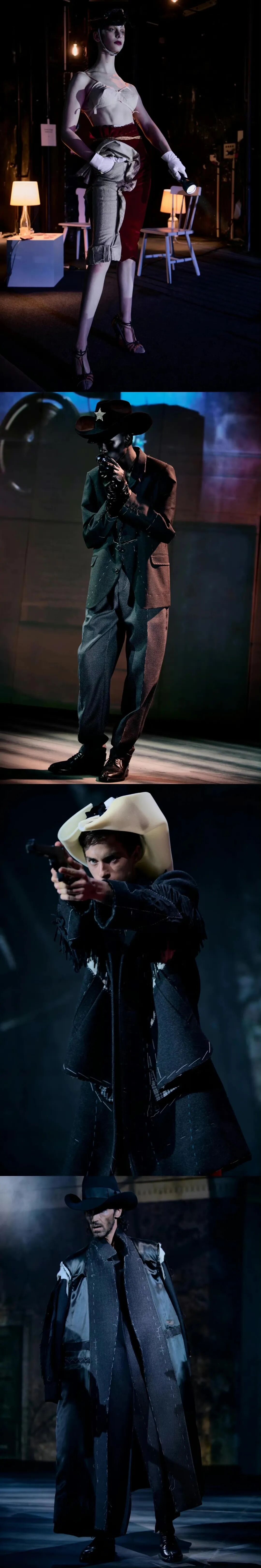 用一出西部电影形式和现场同步话剧演出的手法替代T台秀场,随着爱情故事命运多舛的剧情推进和抓马的演绎,时装也在传递着各种情绪,观者就这样不自觉的跌入到海盗爷强烈的美学体系与疯癫世界之中。
