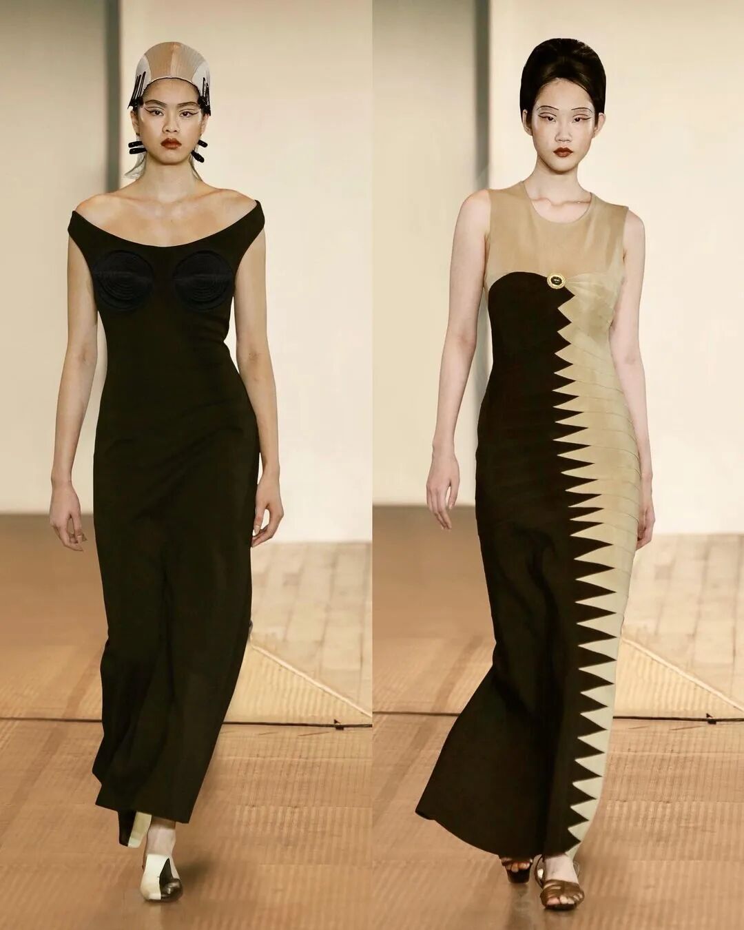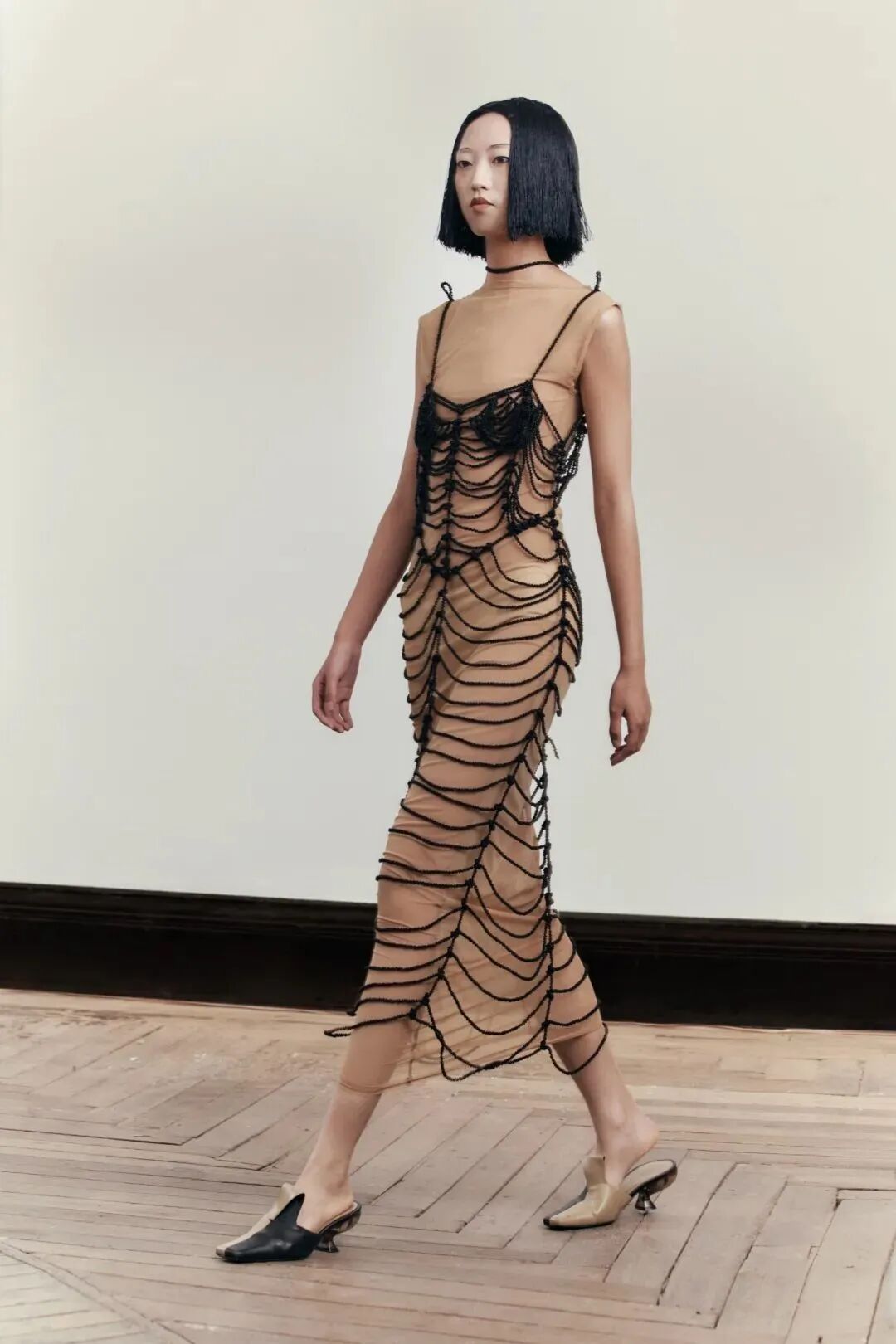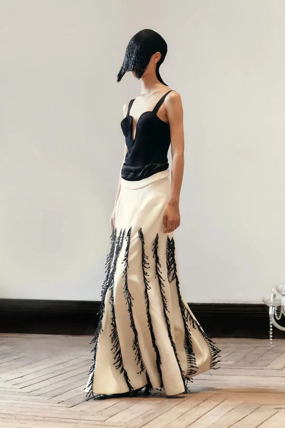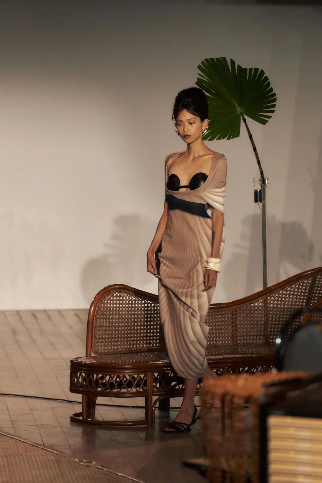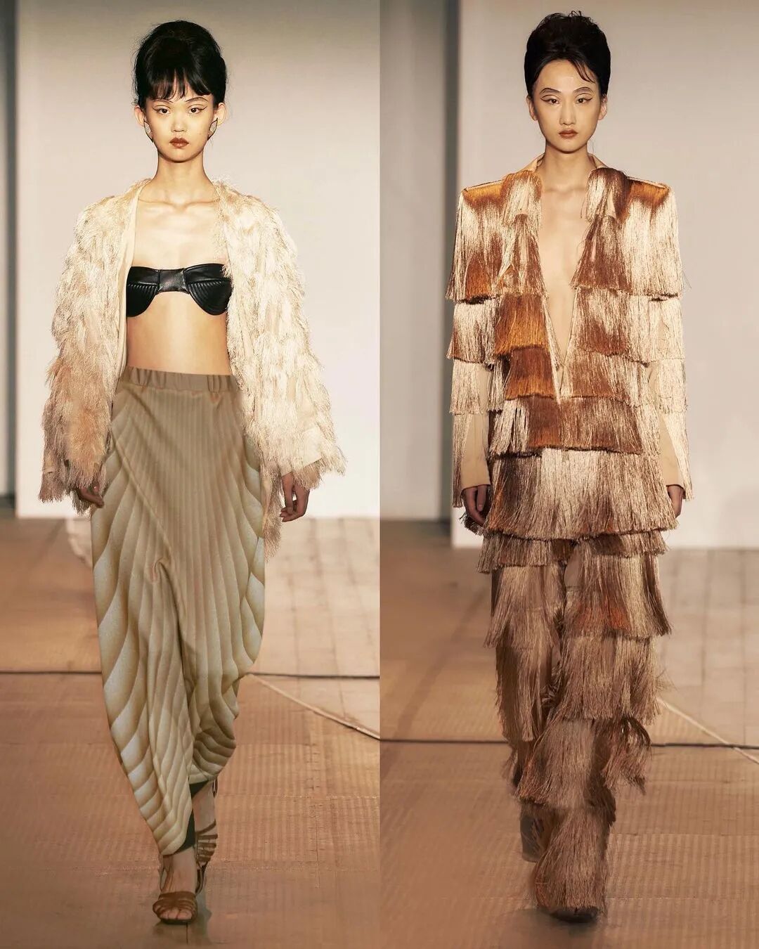 Zhong Zixin充满雕塑感的服装廓形、抹胸、流苏等细节,以及充满褶皱的长裙等,经典元素,也让我们想起往季系列中的一些瞬间。