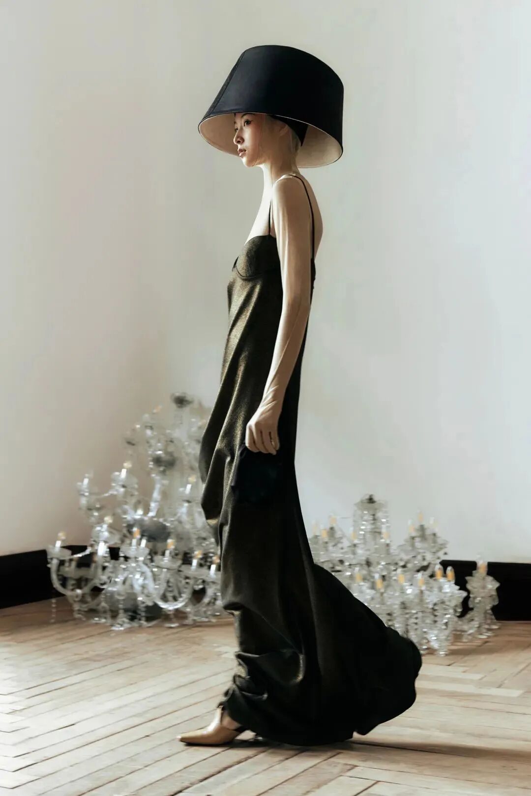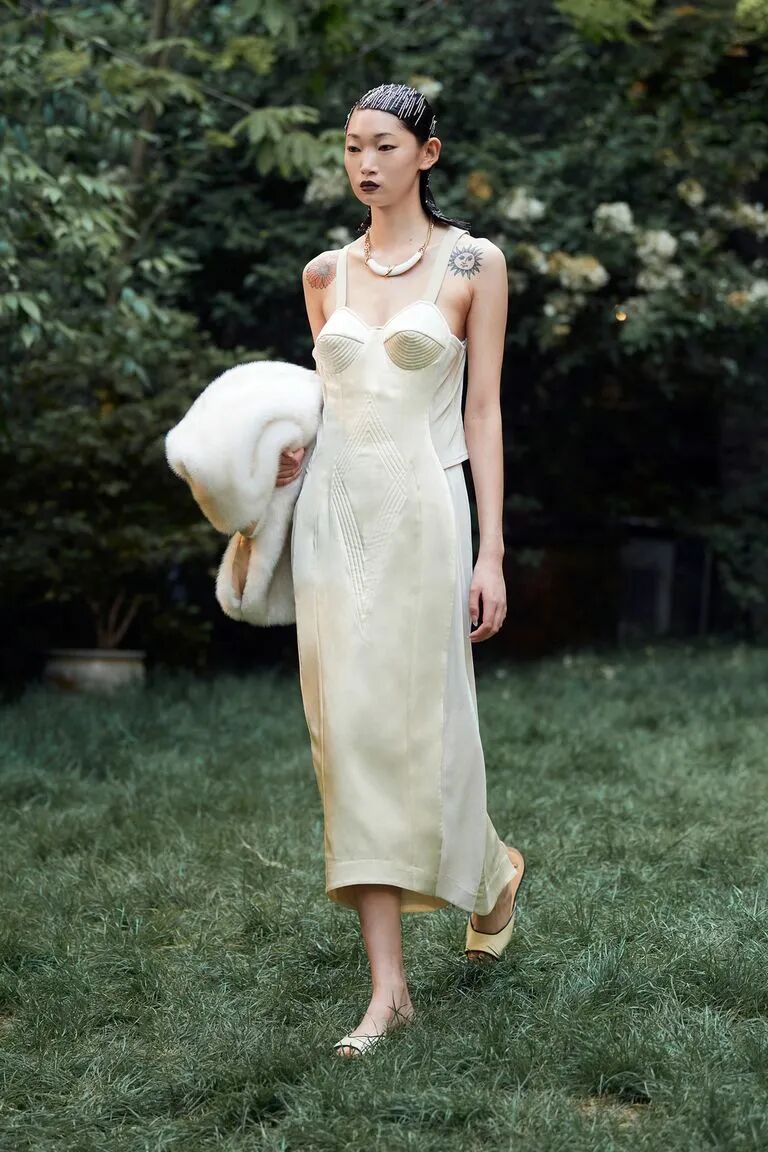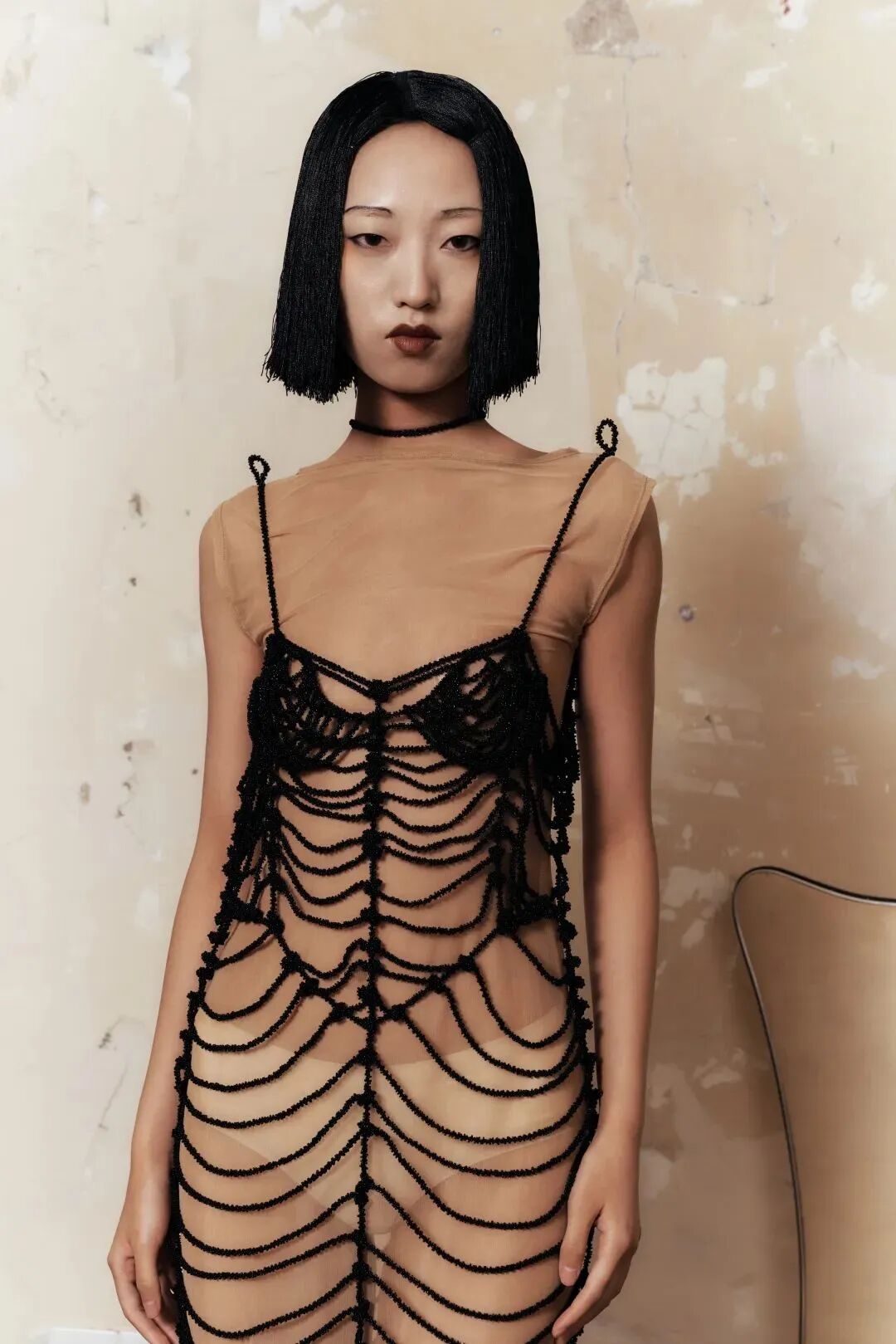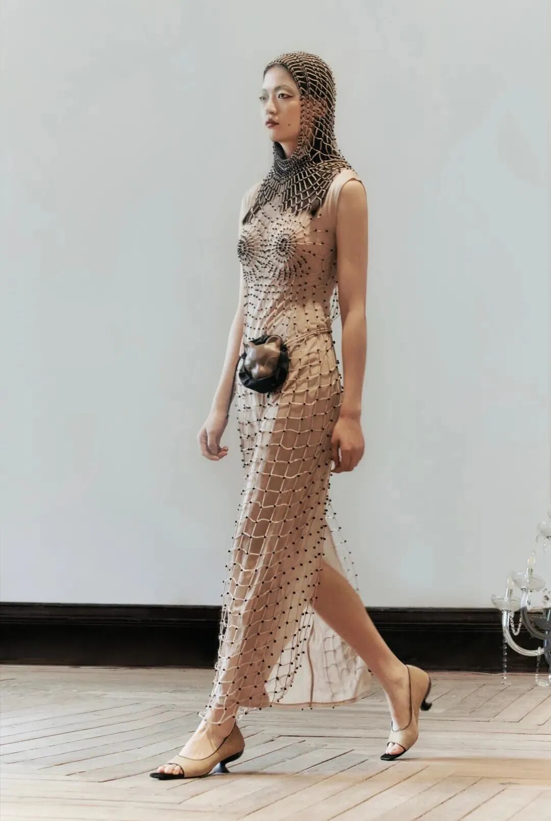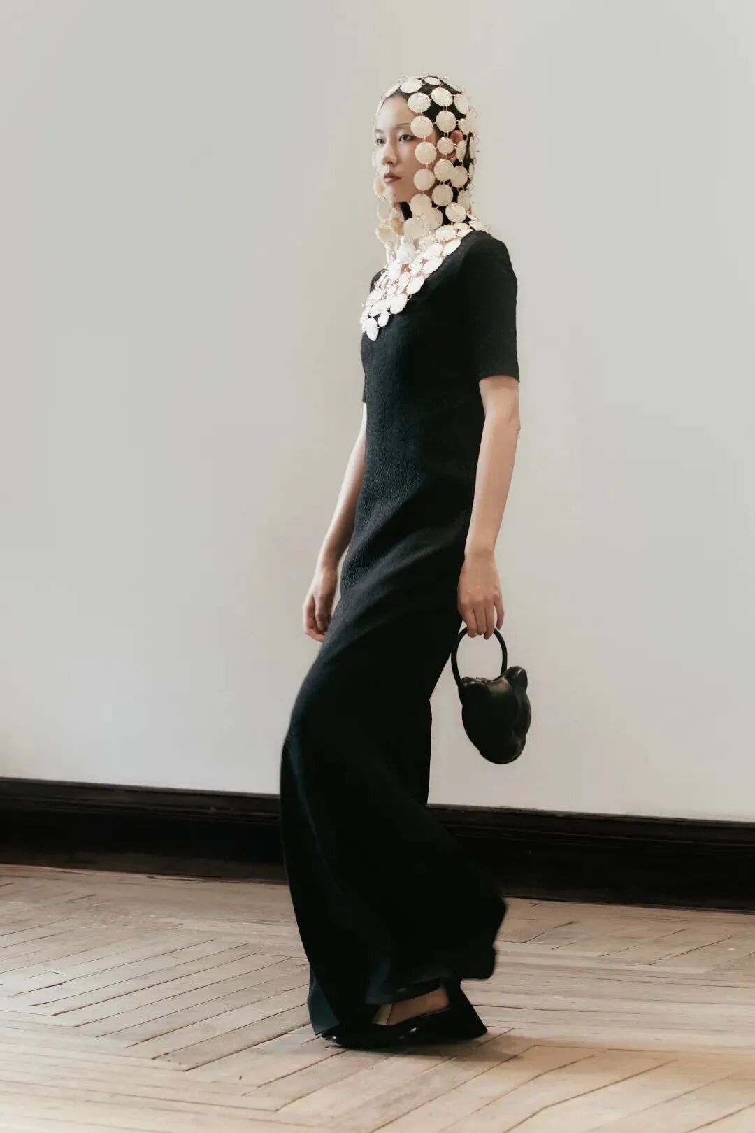 Zhong Zixin充满雕塑感的服装廓形、抹胸、流苏等细节,以及充满褶皱的长裙等,经典元素,也让我们想起往季系列中的一些瞬间。