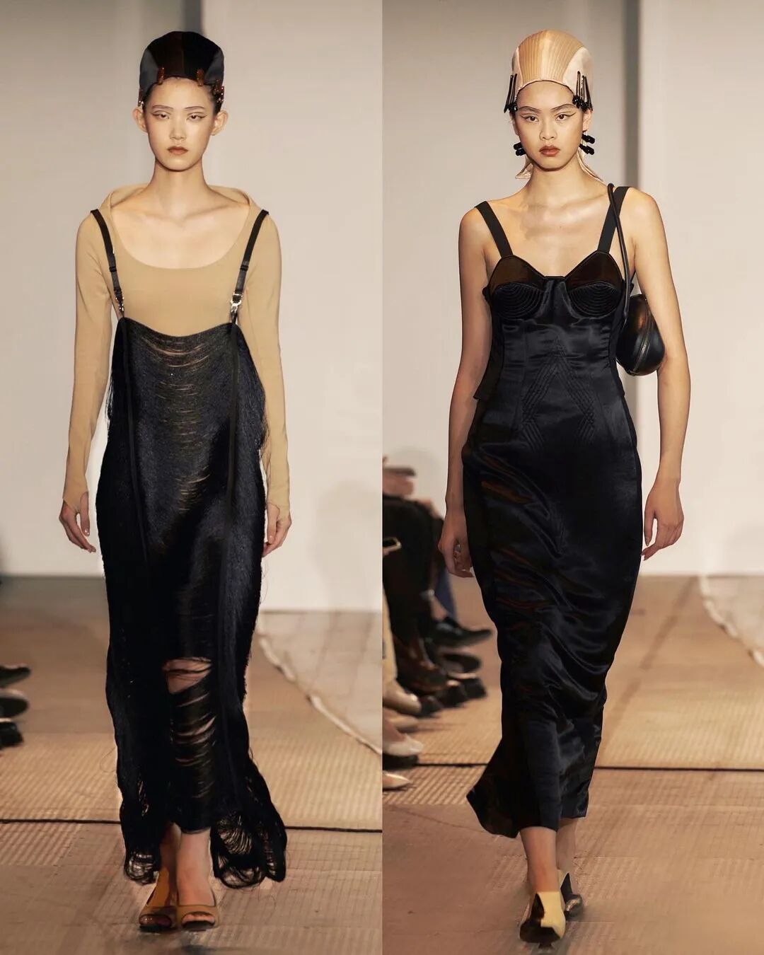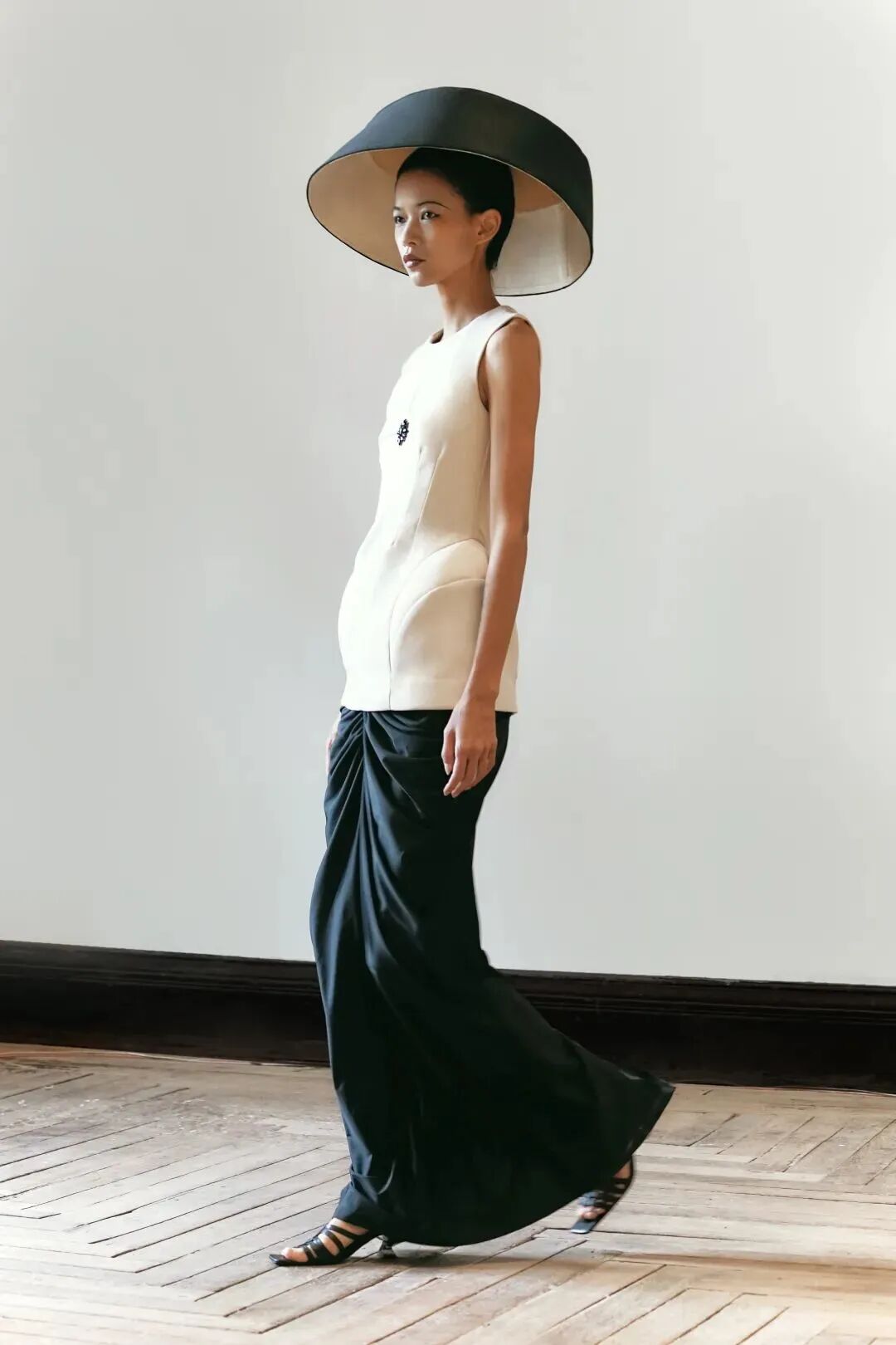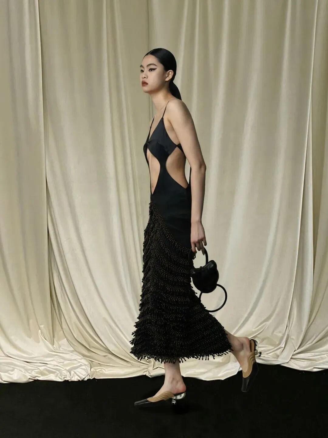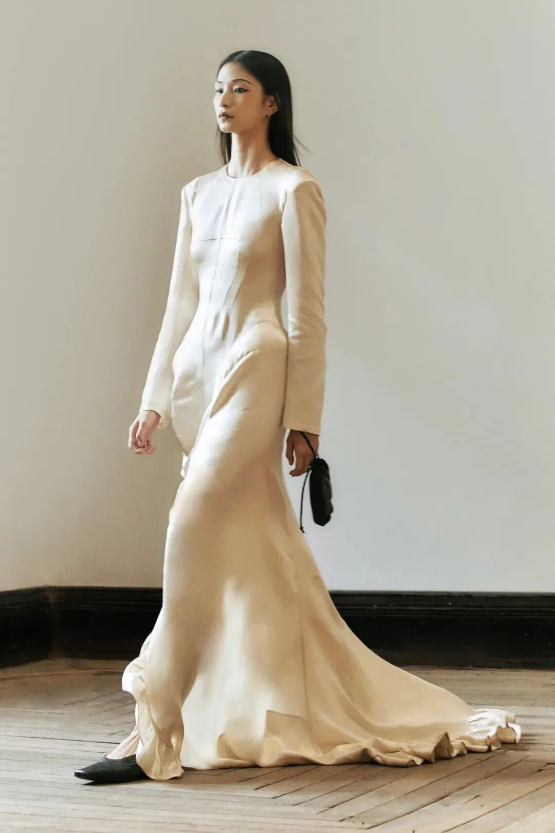 Zhong Zixin充满雕塑感的服装廓形、抹胸、流苏等细节,以及充满褶皱的长裙等,经典元素,也让我们想起往季系列中的一些瞬间。