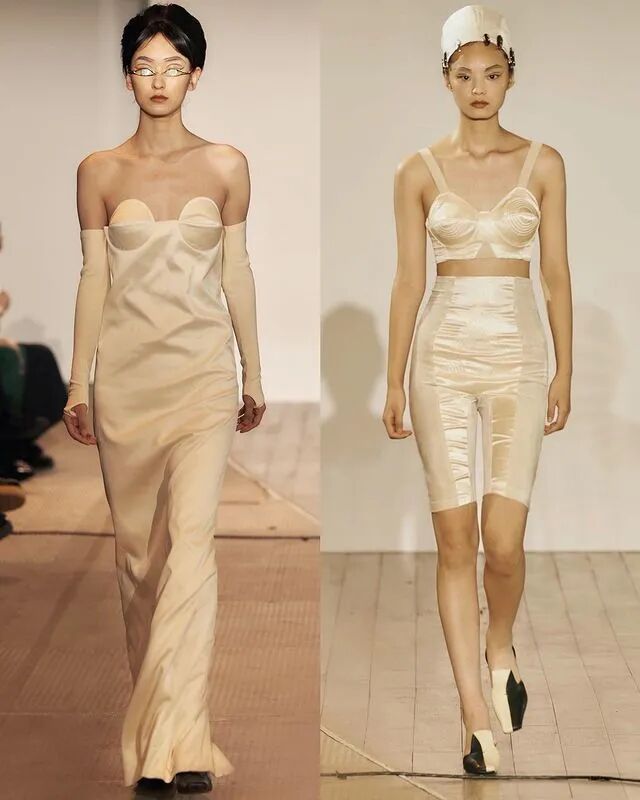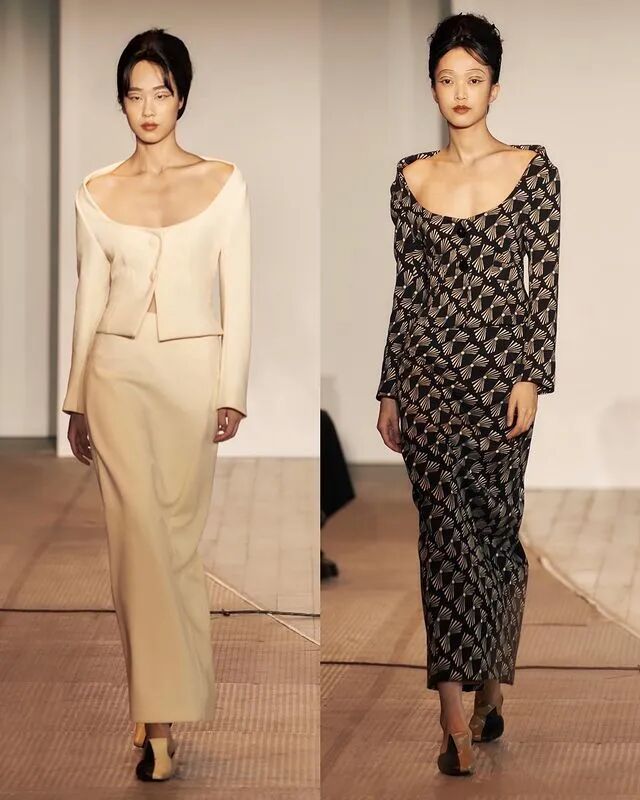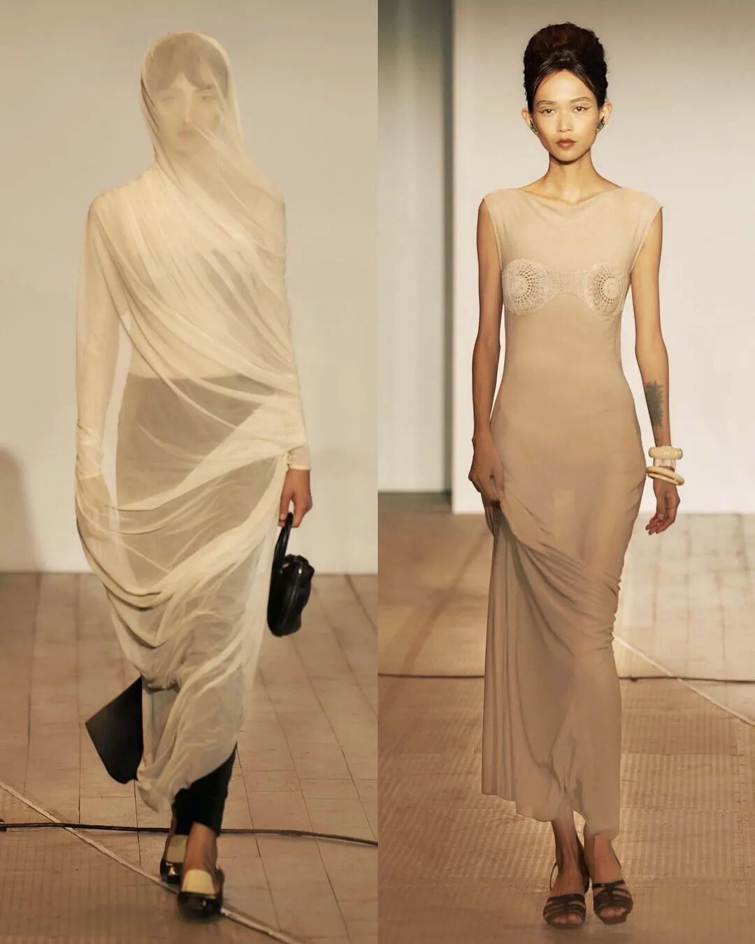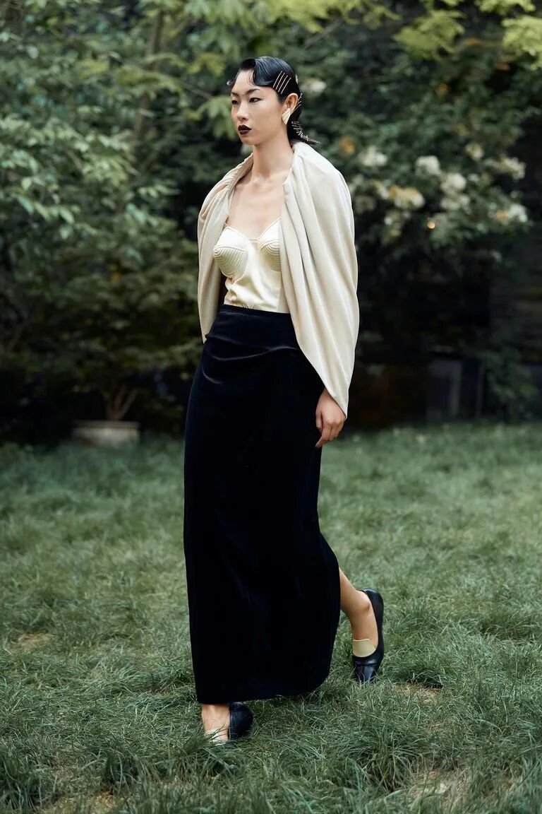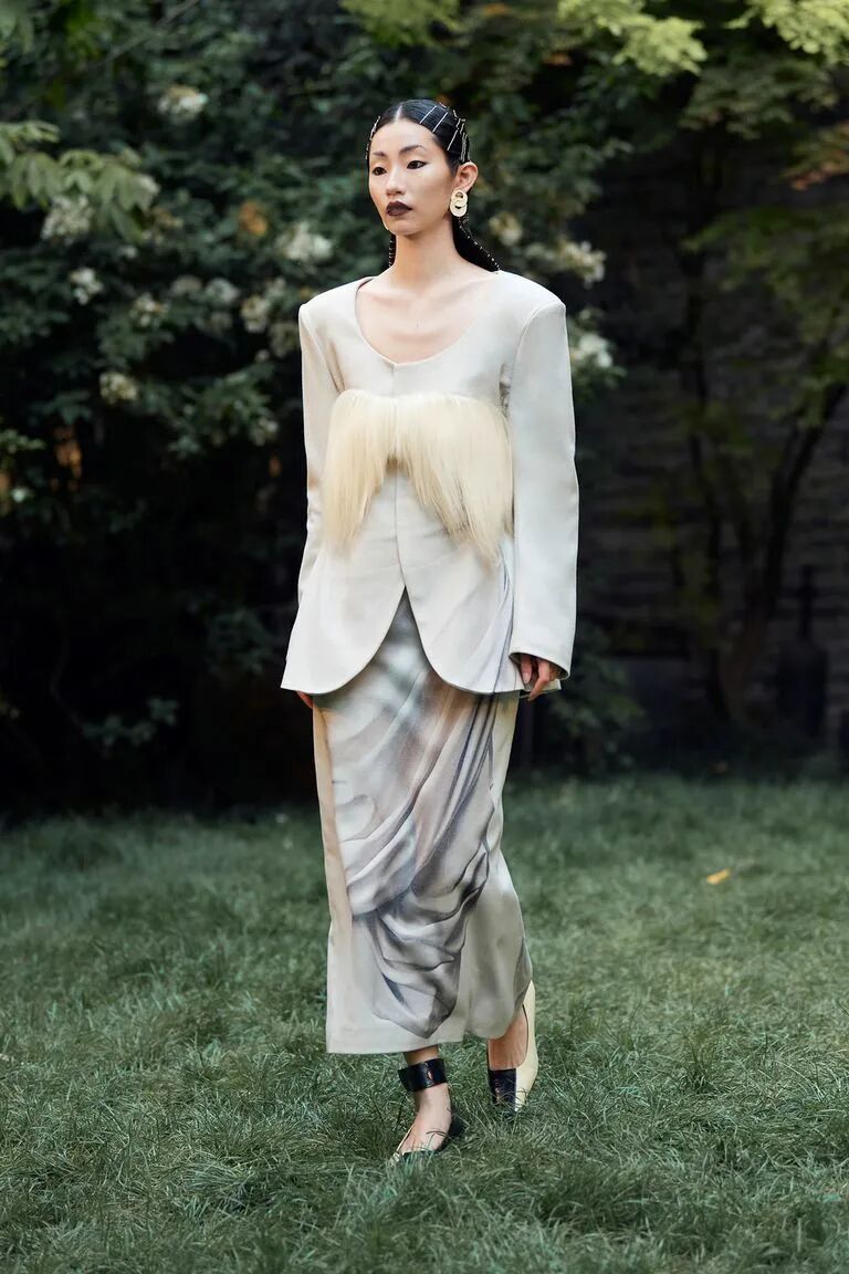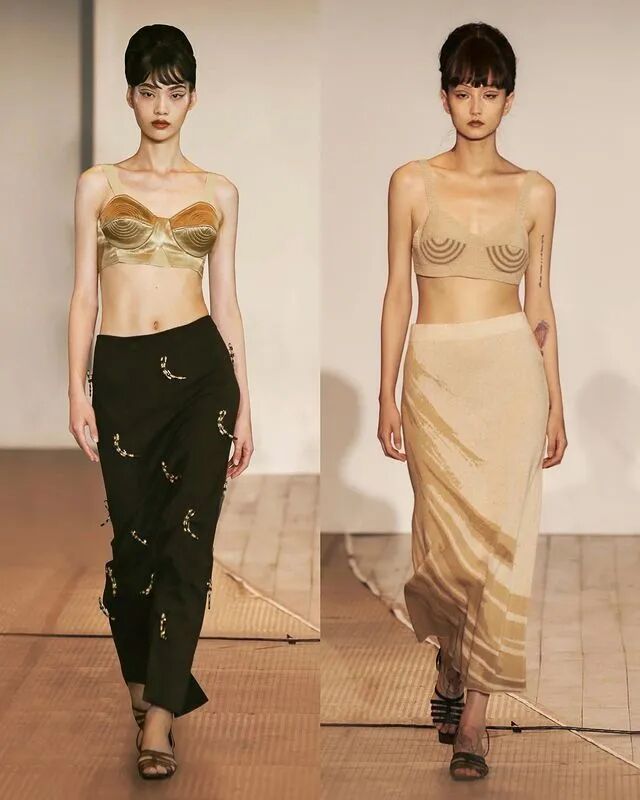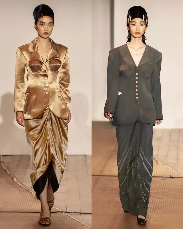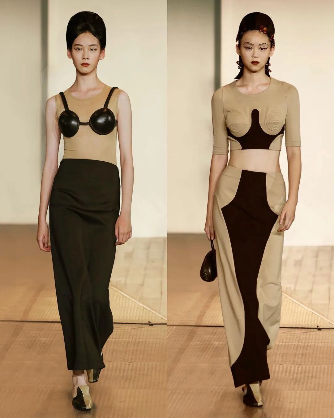 Zhong Zixin充满雕塑感的服装廓形、抹胸、流苏等细节,以及充满褶皱的长裙等,经典元素,也让我们想起往季系列中的一些瞬间。