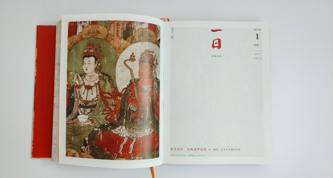 现存的大云院弥陀殿壁画是中原地区遗存的唯一一处五代寺观壁画,是我国古代佛寺壁画中的稀世奇珍。日历选取了飞天图、维摩变相图等,灵动飘逸、丰润秀美的天女与秀骨清像、悠然自得的菩萨共赴佛会之盛景跃然纸上。