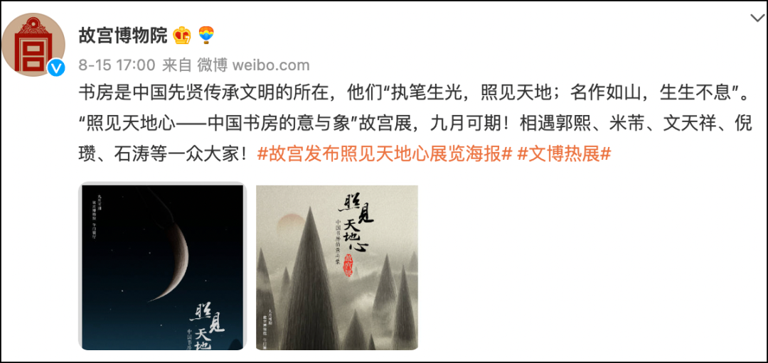 就在几天前,故宫博物院发布了“照见天地心——中国书房的意与象”故宫展的两张国风海报。
