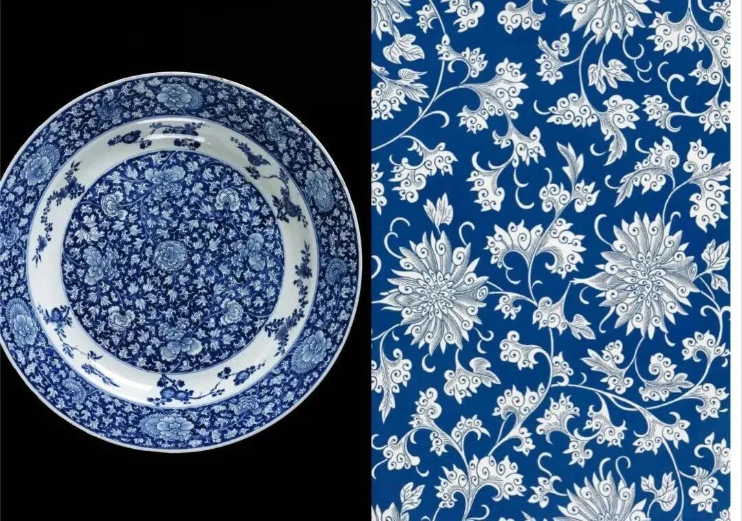 左:清康熙蓝底白花缠枝花卉纹盘