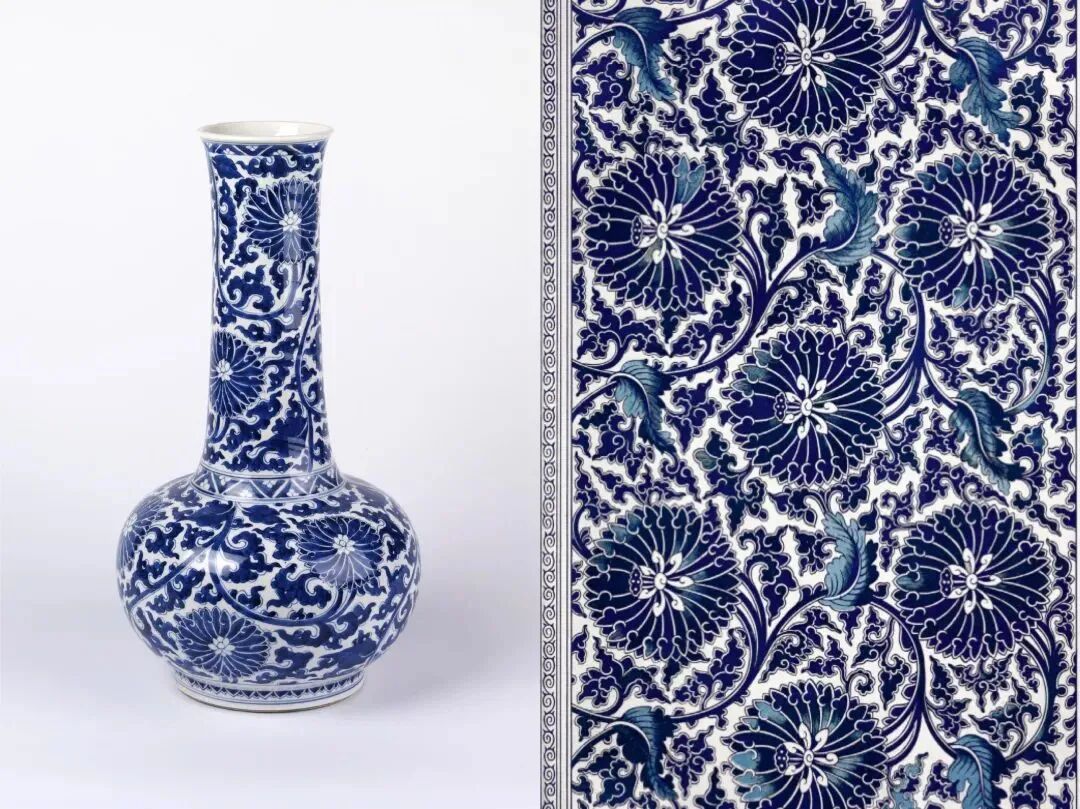 左:清康熙青花缠枝莲花纹长颈瓶