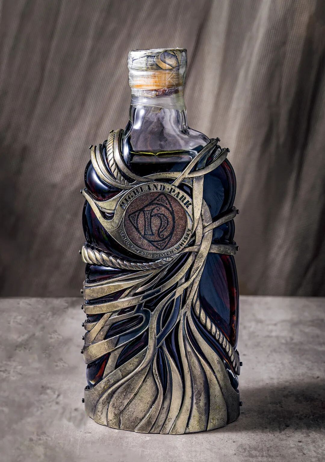 瓶身由纯银打造,缠绕交叠,和玻璃瓶融合为一,并装饰有奥克尼群岛上的岩石,犹如古罗马骑士装,又像是错综复杂盘根错节的百年老树藤。