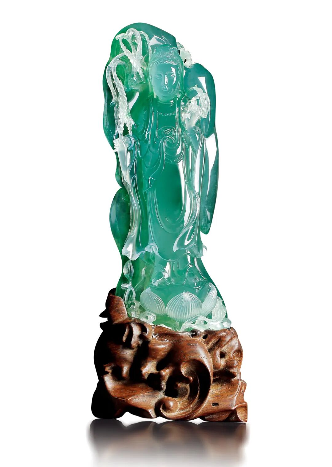此作品做用天然翡翠雕就,整件作品用料尤为难得,质地细腻, 晶莹剔透,水头十足,娇艳欲滴。观音面容慈祥,神态静谧,左 手持杨柳枝,右手持甘露瓶,脚踏莲花宝座。杨柳枝及袈裟等细 节位置处理细致到位,衣裳下摆边角翻卷,仿若迎风飘拂,尽显 雕刻技艺高超。匠人因材施艺,用简约而不简单的线条雕就观音 大慈大悲形象。可为十分难得的珍品。