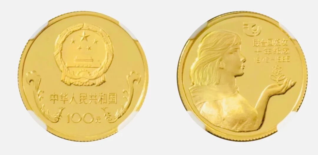 1985年联合国妇女十年纪念100元金质样币一枚