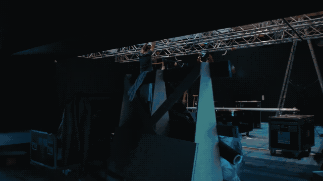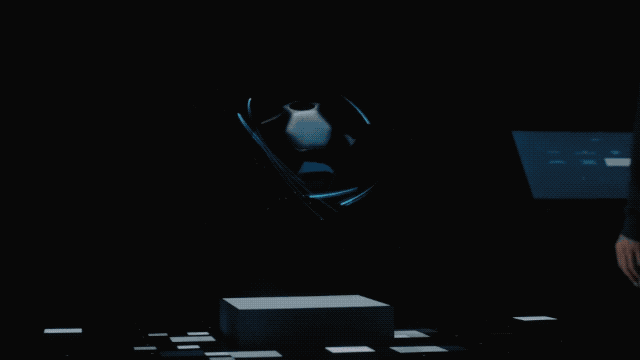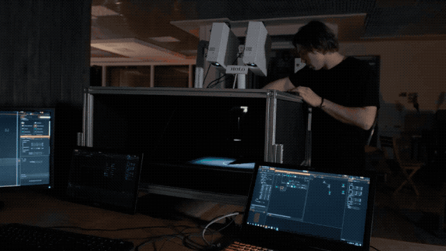 Mixed Reality装置包含LED背景墙和三个投影仪,设计团队将投影图像源嵌入到全息箔片下面的地板中,使得观众能站在与全息图相同的水平面上。