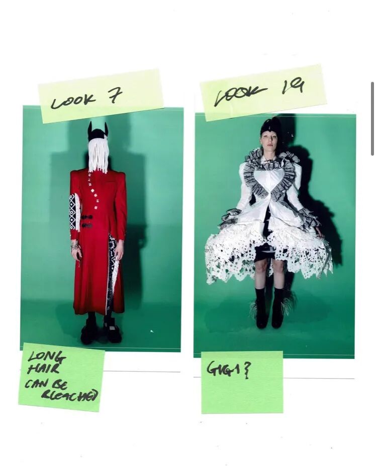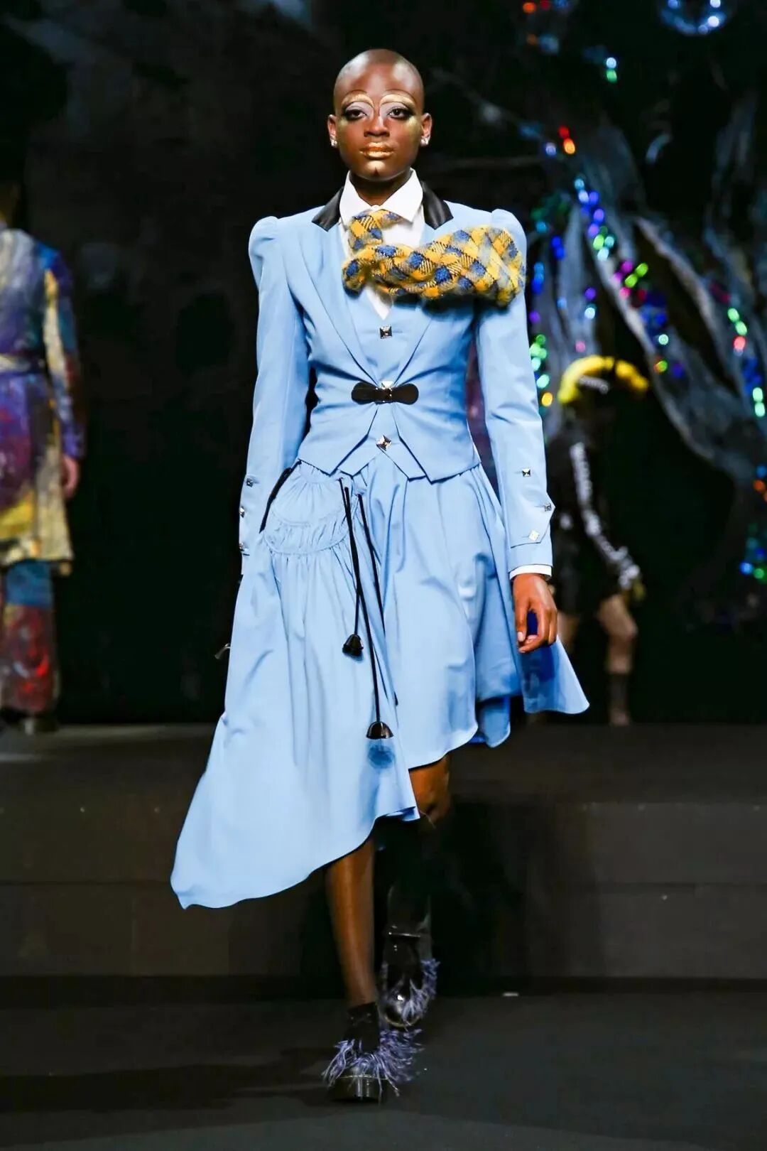在男装的造型设计中,Charles Jeffrey总会融入许多固有女性化的影子,浪漫与荒诞的结合仿佛是在性别的边界来回的试探,而在夸张的表达中极具张力的设计与戏剧性的情节又凝结出一种力量,深深的打动着每一位观众的心。