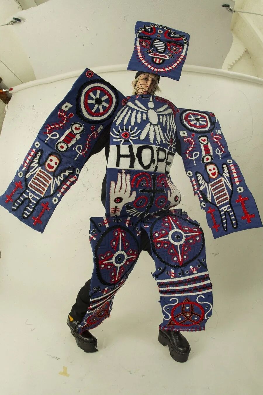 在Charles Jeffrey的设计中,许多带有驱邪的纹样在防护服中出现,那些代表着健康、社区和希望的符号散发着光。