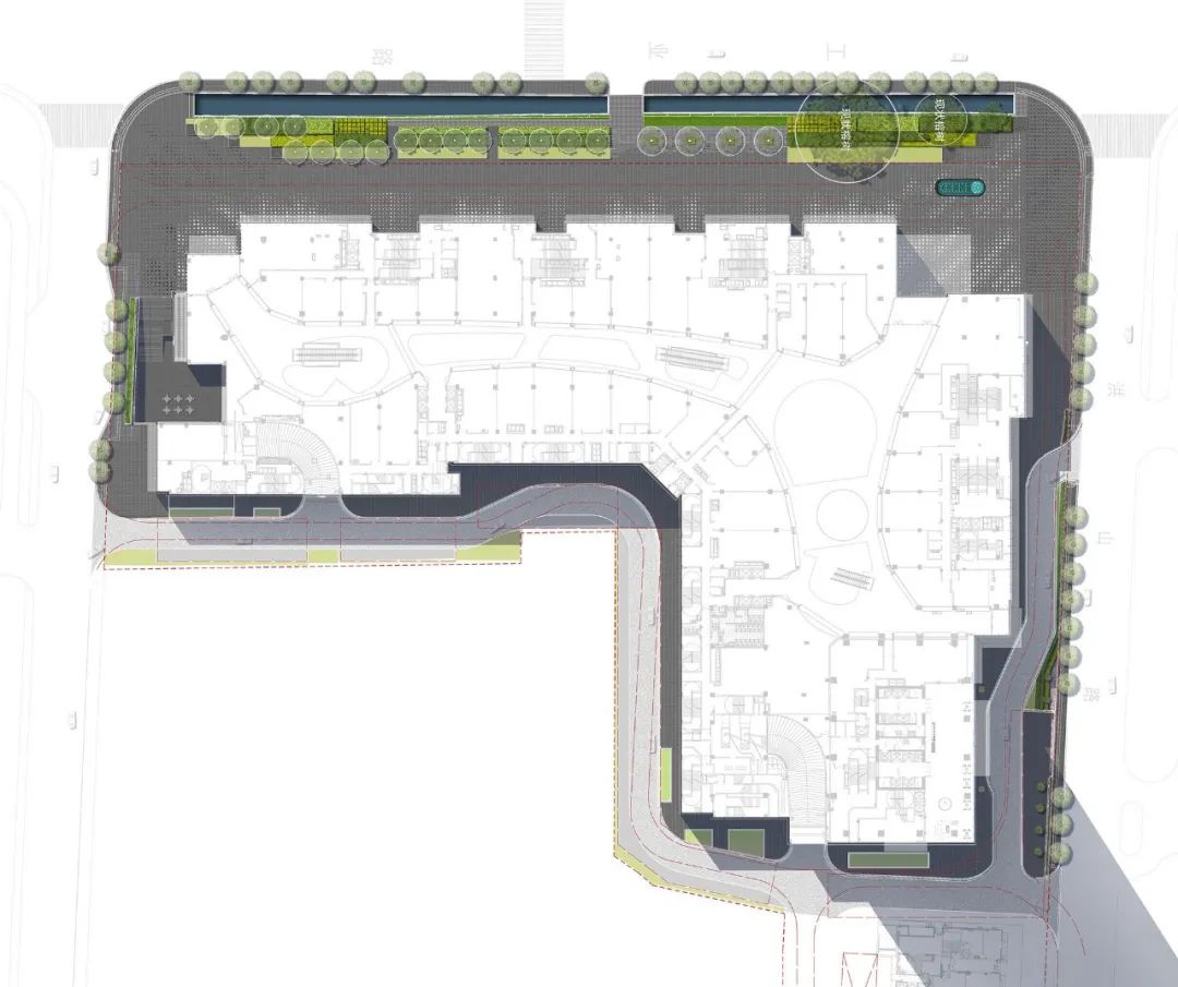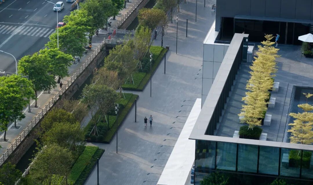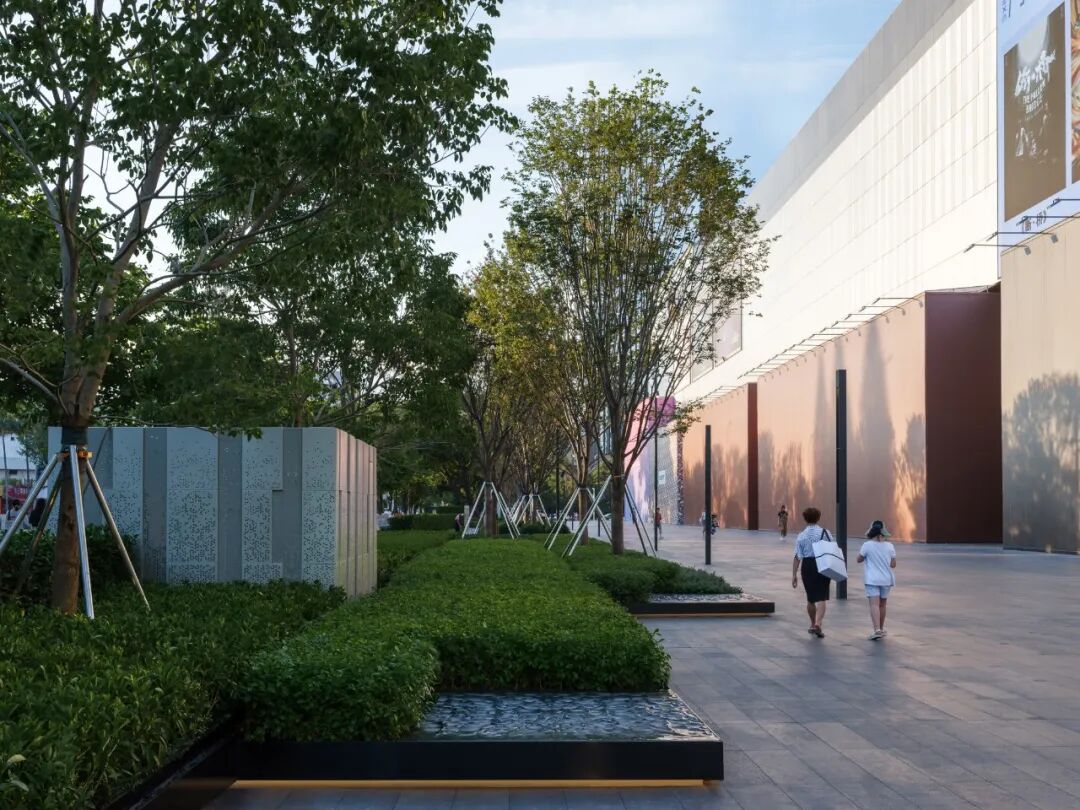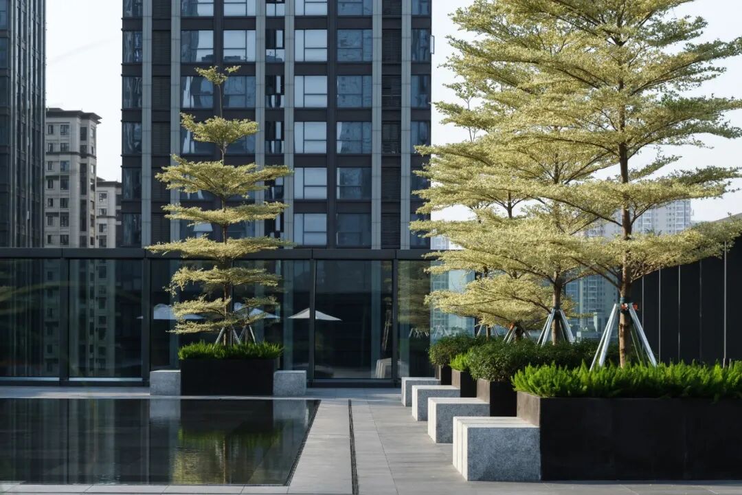 屋顶花园的镜面水池现代简洁,搭配阵列排布的小叶榄仁,与地面广场的空间格局协调呼应。