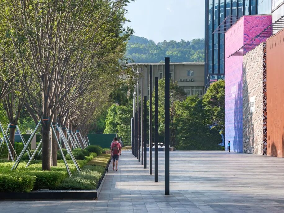 后场是一条介于商业跟住宅之间的服务型通道,我们以简洁干净的处理方式,利用植物绿篱及松散的竹墙与场地周边的大树形成辉映,让后巷空间成为行人的捷径,同时也为开车进入场地提供舒适的体验感。
