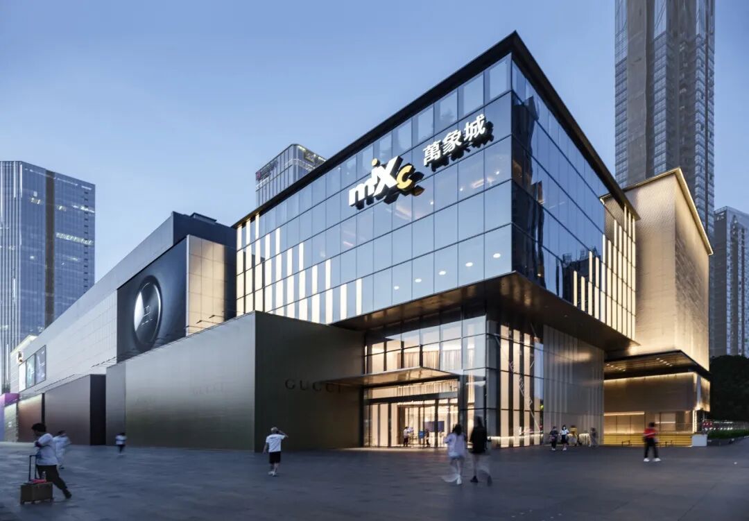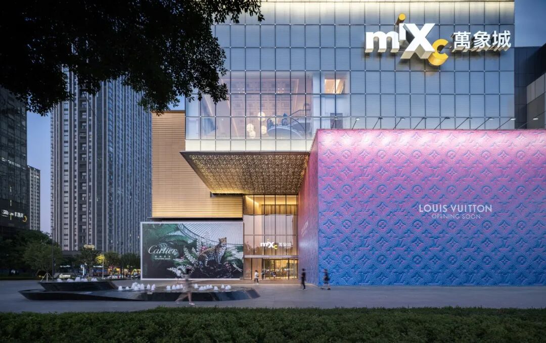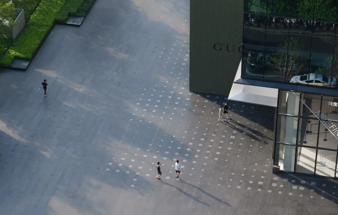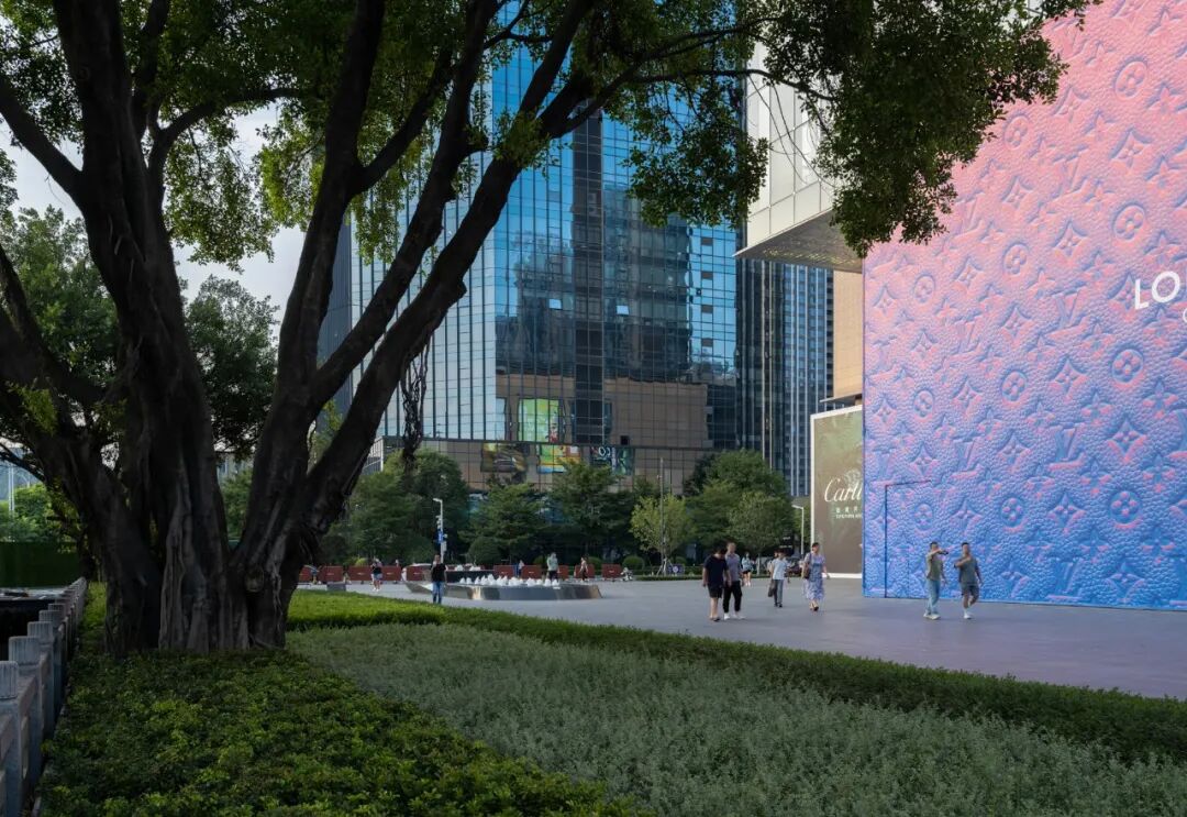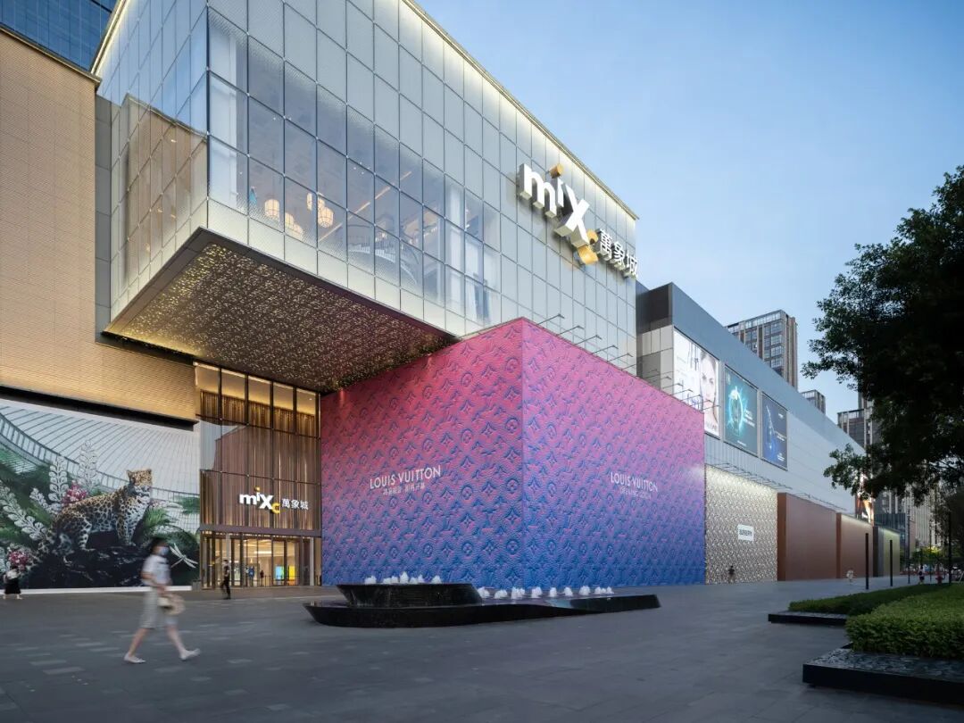人来人往的广场让大品牌店有了很好的展示空间,未来各品牌的个性、肌理、纹案还有色彩在店内灯光的投射中,于广场上形成鲜明的空间特色,让所有走过广场的市民或是前来拍照打卡的游客,成为这场时尚大秀的主角。