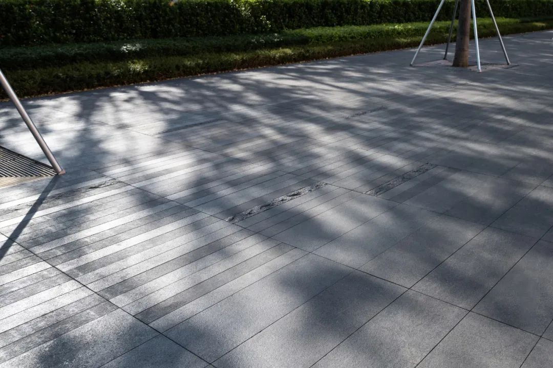 铺装形式从比较碎的有机颗粒慢慢向干净简洁的整体感过渡,呼应了大品牌店向城市界面过渡的空间效果。