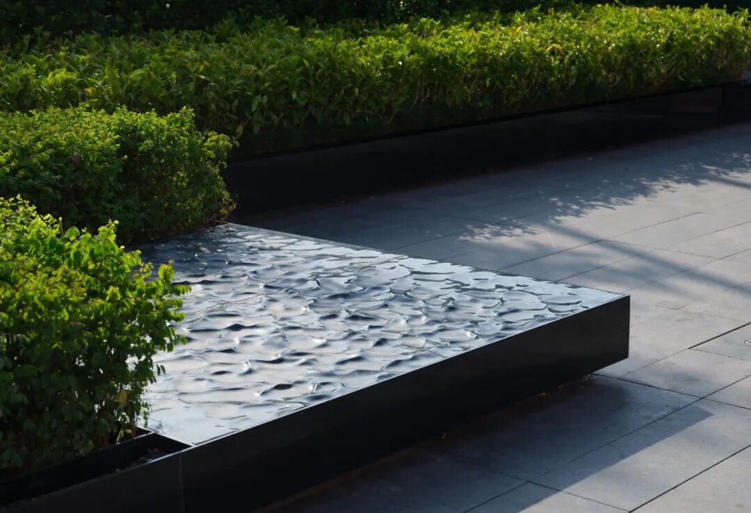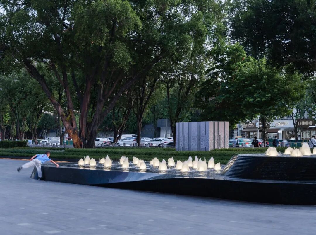 从水景到地面铺装,包括一些类似水波纹与方盒子结合的异态石材处理方式,都可以看到这样的细节处理。