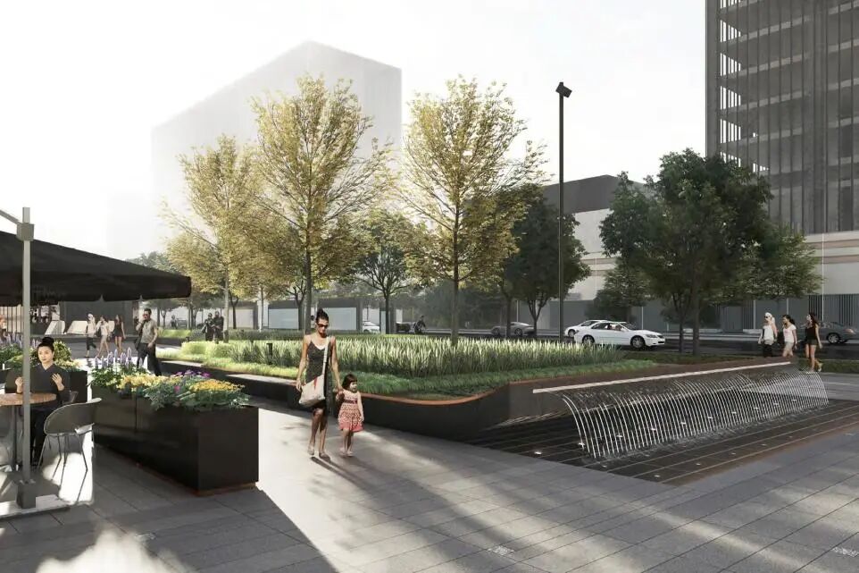 考虑到消防登高的限制,我们将道牙降低到两公分高来减弱对办公入口空间的干扰。利用简洁且富有艺术感的的金属花钵与城市界面进行阻隔与梳理,从办公楼向外望既是一个观赏点,又是城市街道的背景界面。