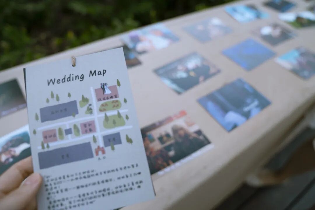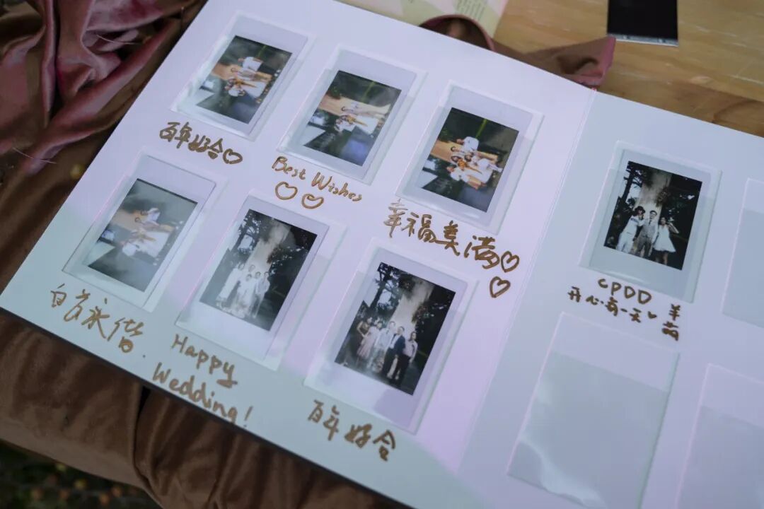 签到处跟新人合影的地方会拍立得合影,立刻可以拿到照片放在准备好的相册里,然后来宾可以在照片下面留下对新人简单的祝福。