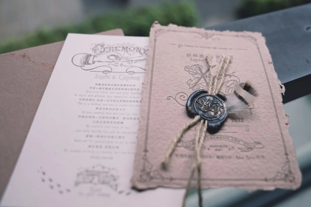 从收到请柬的时候就感受了用心,现在的婚礼,大多是发给你电子贺卡,打个电话亲自说已经很有诚意了,这次是新人们是专门约了时间见面亲自给的。精挑细选的手工纸,自己设计的LOGO,信封上的火漆印和羽毛,每封信都是亲自写好盖好的,足见诚意。