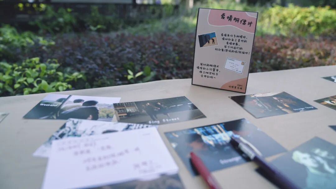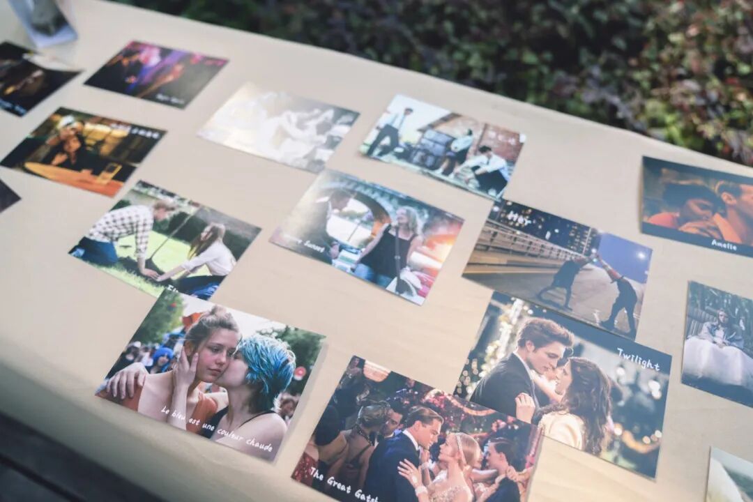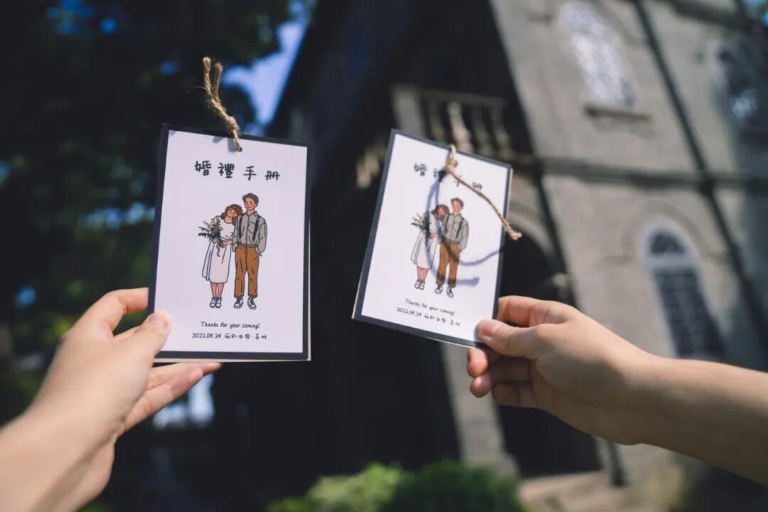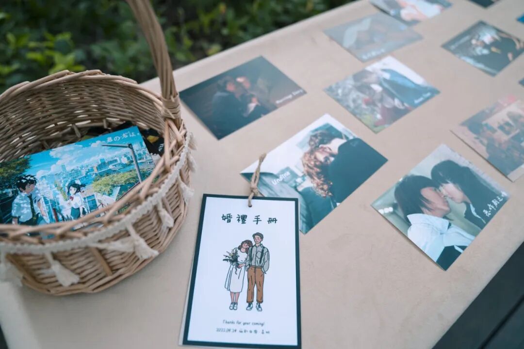 新郎喜欢看电影,他和新娘精选了喜欢的66部电影配上一句台词制成明信片,甚至细节到法国的电影上面写的都是法文。