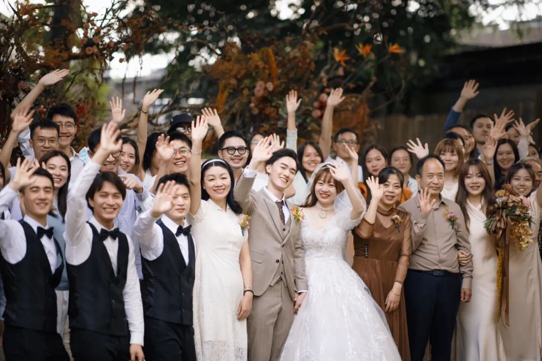 来宾一共只邀请了60个人,包括双方的亲友,最后有一张跟大家的合影,所有人都有出现在照片上,非常有纪念价值。