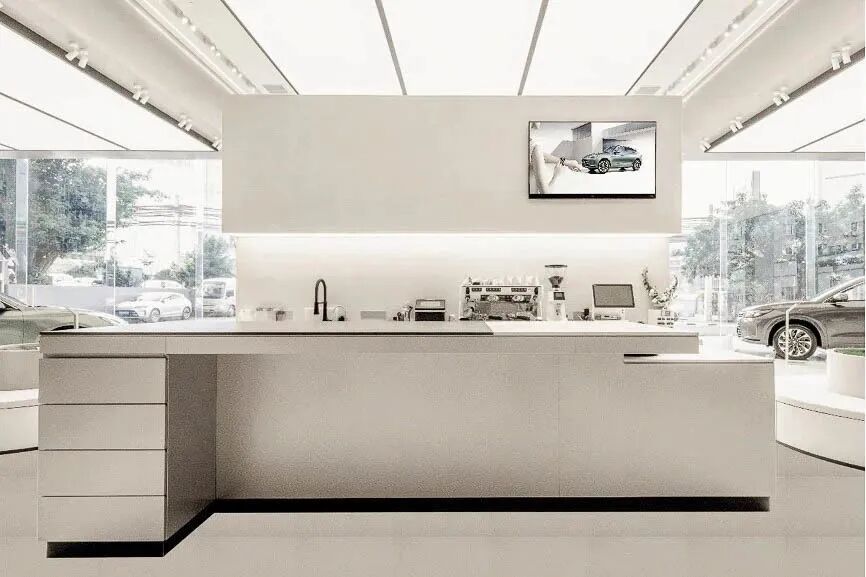 最吸引眼球的大屏幕背后同样藏有新意,既作为后方精品休闲区的空间分割,亦发挥着咖啡吧台的作用。AITO的咖啡吧台向每一位来访用户开放,提供精品鲜萃咖啡,品牌欢迎并期盼每一位亲临的用户能在最放松的状态下分享他对AITO的感受。