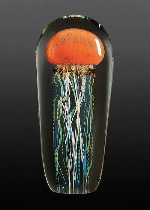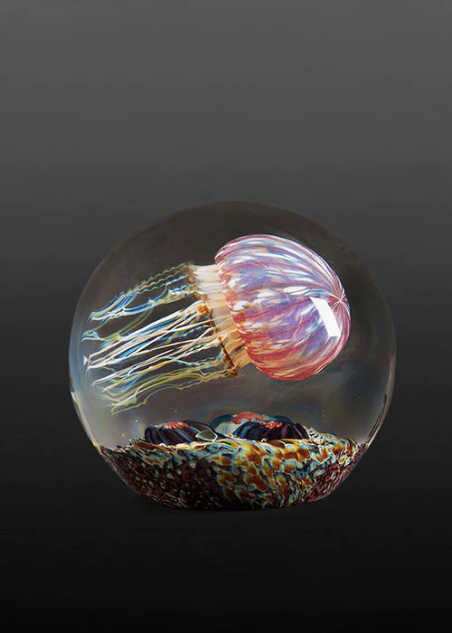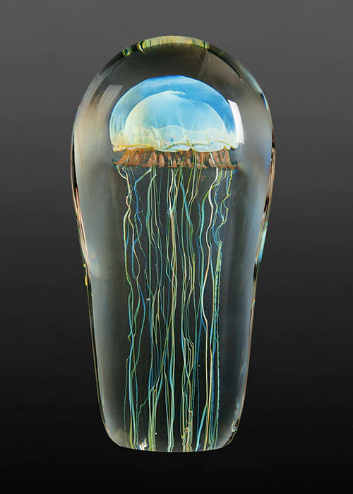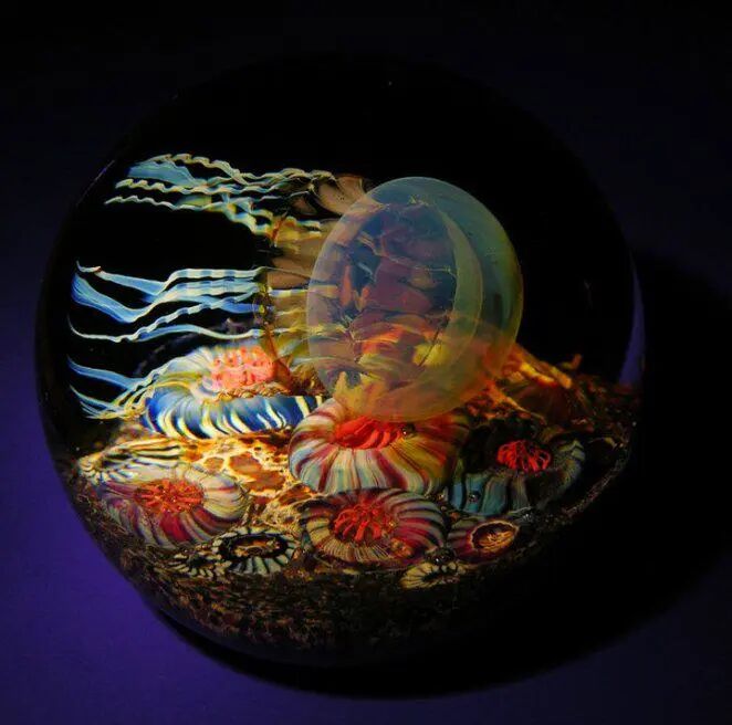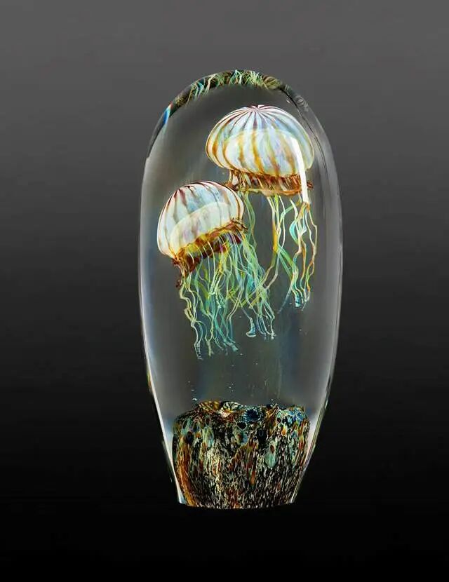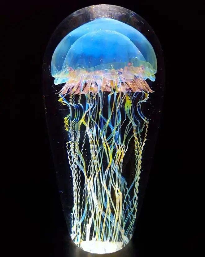 总之,草图、设计、高温烧制、降温冷却、塑形、研磨、抛光等等复杂的步骤,一个都不能少,才能最终呈现出一个华丽无比的,迷人的水母手工吹制雕塑,艺术家以生动的调色板,逼真地再现了这些海洋动物的形状。接下来,我们就一起欣赏一下吧。