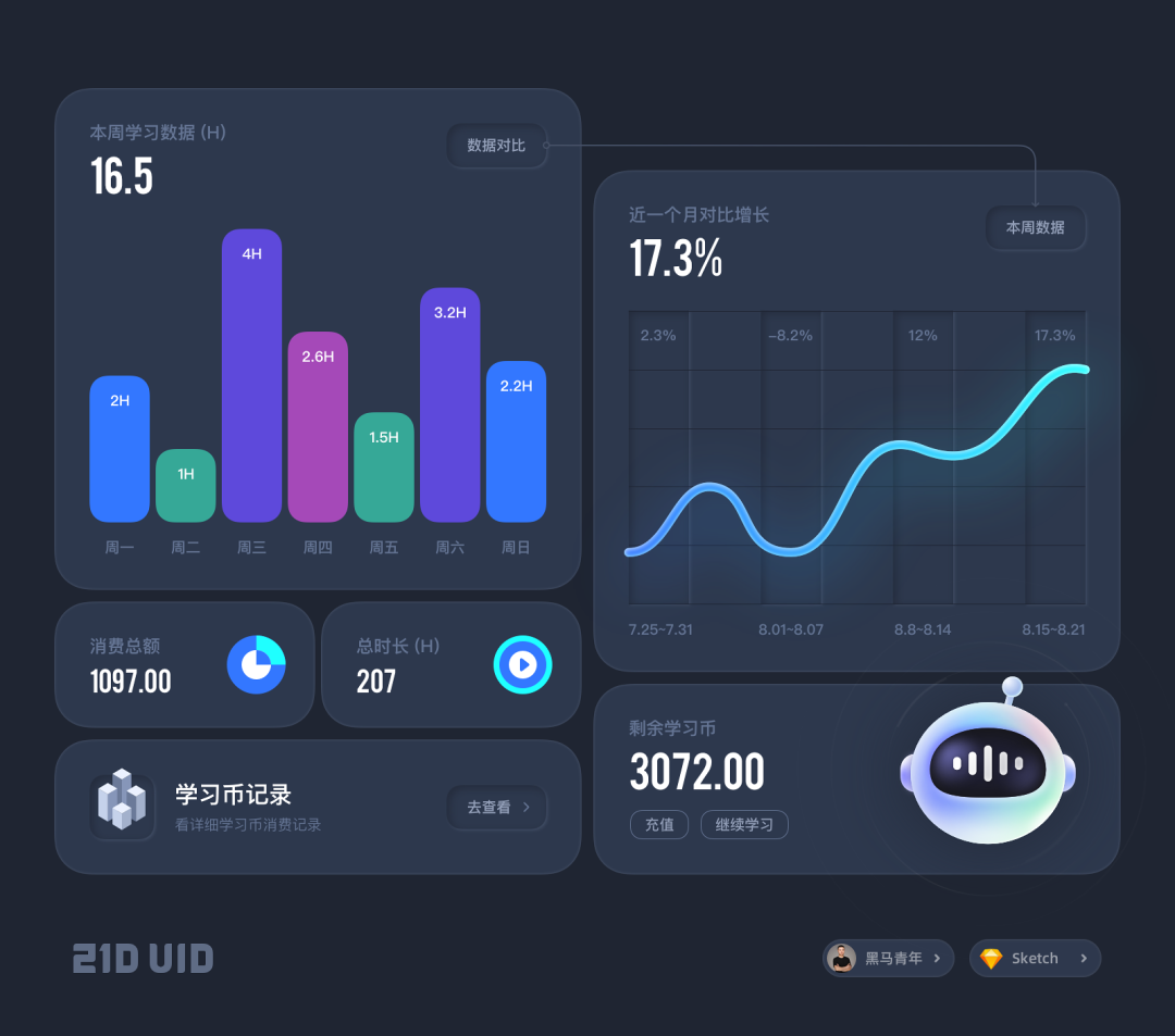 整个课程周期为 21 天,录制了 10 节视频教程进行案例实战,每节课后布置对应的打卡主题。完成作业之后发黑马哥微信进行一对一指点修改,确保掌握每一个技能知识点。也会加入交流群,和更多设计师一起交流,互相进步。