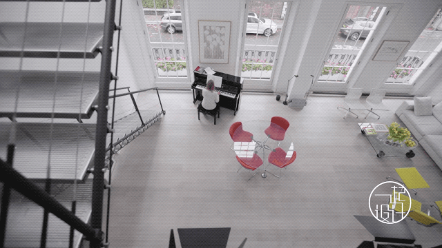 13扇窗户照亮整个空间。从底层入口通过一个蜿蜒的金属楼梯,即可到达客厅。
